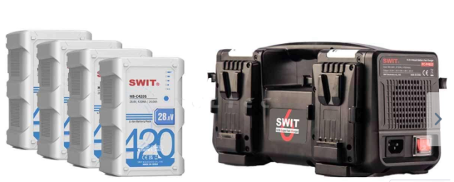 Batérie dopĺňa 4-kanálová rýchla nabíjačka Swit PC-P461S, ktorá dokáže nabíjať až štyri batérie V-Mount súčasne pri 33,6 V/3 A s výkonom 100 W na kanál. Táto vysoko účinná nabíjačka môže skrátiť dobu nabíjania až o 60 % v porovnaní so štandardnými nabíjačkami a dosiahnuť 80 % kapacity za pouhých 2,5 hodiny. 3,5-palcový farebný LCD displej poskytuje jasné informácie o stave, vrátane počtu cyklov batérie, zatiaľ čo veľké indikátory nabíjania zabezpečujú jednoduché monitorovanie.