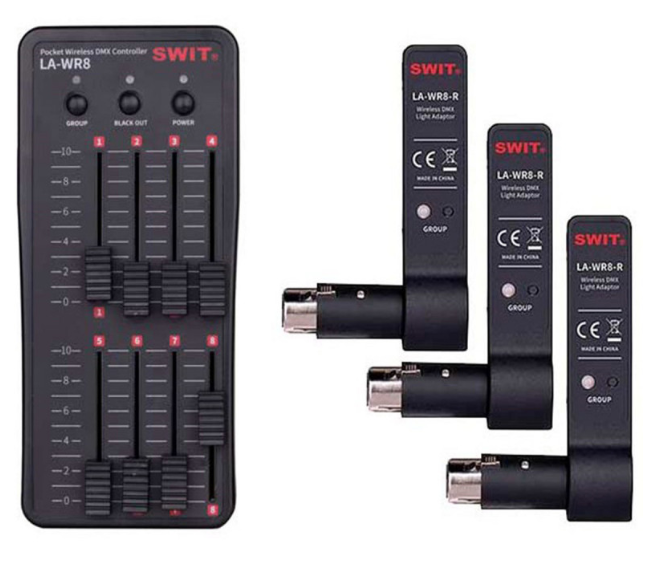 Súprava SWIT LA-WR8 Tx+3Rx je bezdrôtový DMX ovládač vo veľkosti vrecka, ktorý obsahuje 1 vysielač a 3 prijímače a ponúka bezdrôtové ovládanie 2,4 G až do vzdialenosti 400 m (LOS). Je kompatibilný so všetkými štandardnými svetlami DMX512, eliminuje zložité káblovanie a umožňuje rýchle ovládanie osvetlenia typu plug-and-play pre produkcie v teréne aj v štúdiu.