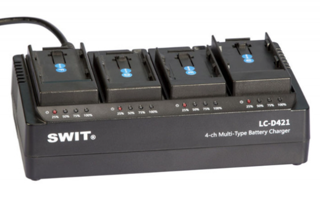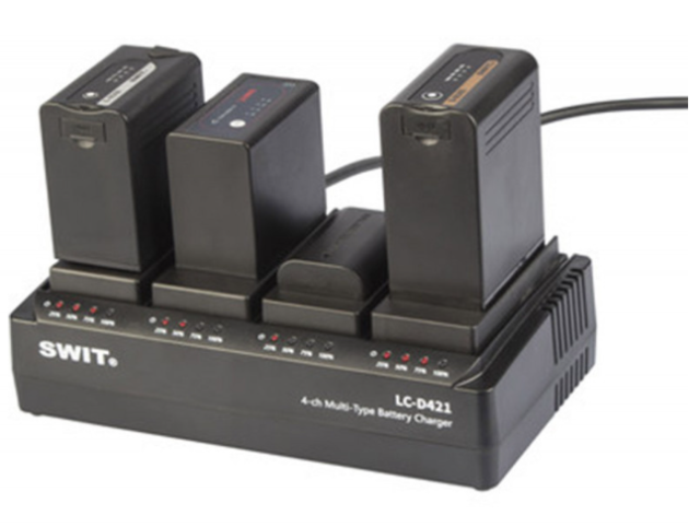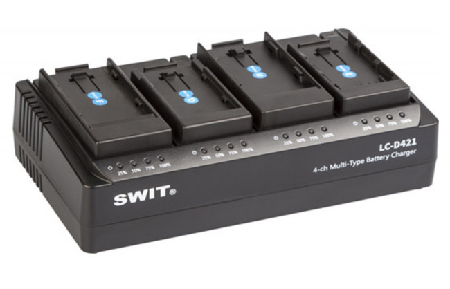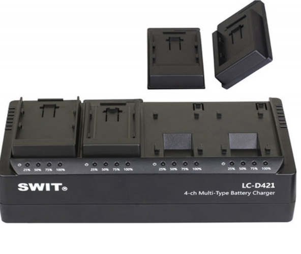 SWIT LC-D421I KIT je 4-kanálová nabíjačka DV batérií so 4 zasúvateľnými doskami typu JVC SSL, schopná súčasne nabíjať štyri batérie pri 2 A na kanál. Vymeniteľné dosky umožňujú nabíjanie rôznych typov DV batérií s LED indikátormi v reálnom čase pre každý kanál.