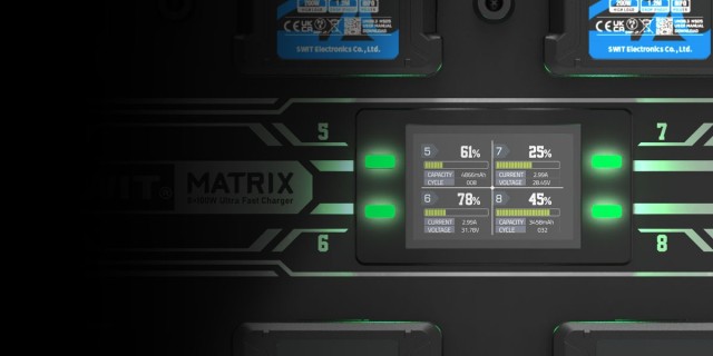 SWIT MATRIX-B8 je vysoko pokročilá 8-kanálová simultánna nabíjačka navrhnutá špeciálne pre batérie s B-konektorom. Poskytuje ultra rýchle nabíjanie s maximálnym výkonom 100 wattov na kanál. Nabíjačka podporuje široký rozsah vstupných napätí, prijíma striedavý prúd od 100 V do 240 V pri frekvencii 50/60 Hz, vďaka čomu je vhodná na celosvetové použitie.