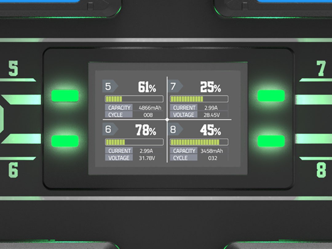 MATRIX-B8 podporuje rýchle simultánne nabíjanie až ôsmich batérií s B-konektorom, napríklad zo sérií SWIT HB-A290B a BIVO, čo umožňuje efektívny pracovný postup a minimalizuje prestoje v profesionálnych prostrediach produkcie videa. Jeho nabíjacie technológie sú navrhnuté tak, aby poskytovali stabilné napätie a výstupný prúd s cieľom maximalizovať životnosť batérie a zároveň poskytovať najvyššiu rýchlosť nabíjania.