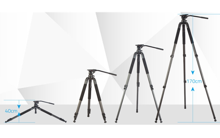 Jeho 3-dielne nohy sú nastaviteľné od 40 cm do 170 cm s nastavením uhla nôh 25°–75°, zatiaľ čo plynulá hlava podporuje až 10 kg a disponuje dynamickou protiváhou pre presný pohyb kamery. Statív ponúka otočenie o 360° a naklonenie od -75° do +90°, čím vyhovuje širokej škále uhlov snímania.