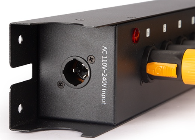 PA-J616 podporuje široký rozsah vstupného striedavého napätia od 110 V do 240 V pri 50 Hz a poskytuje maximálne zaťaženie až 3500 W s maximálnym prúdom 20 A. Používa bezpečné 3-žilové 16 A samozamykacie (otočné) letecké zástrčky pre vstup aj výstup, čím zabezpečuje bezpečné a kontrolovateľné napájacie pripojenia. Každá výstupná linka môže byť použitá na sériové pripojenie svietidiel, čo je ideálne pre inštalácie, kde je viacero svietidiel napájaných z jedného distribučného bodu.