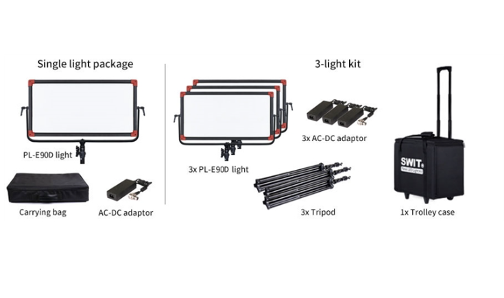 SWIT PL-E90D 3KIT je profesionálne prenosné osvetľovacie riešenie určené pre vysielanie, dokumentárne filmy, rozhovory a štúdiové aplikácie. Každý LED panel PL-E90D používa 480 okrajových SMD LED diód v kombinácii s unikátnou technológiou 90° svetlovodu SWIT, čím produkuje mimoriadne mäkké, jasné a rovnomerne rozložené svetlo pri zachovaní tenkého a ľahkého dizajnu.