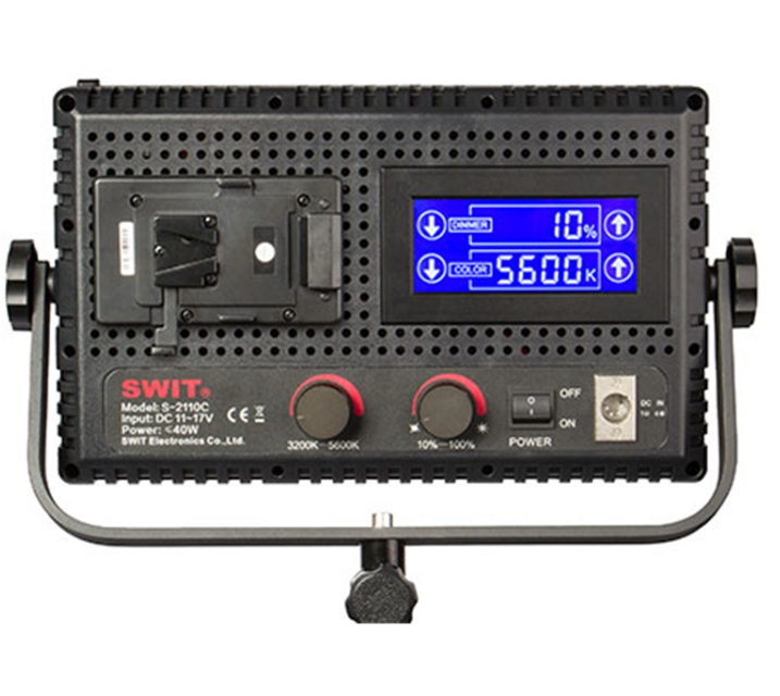 SWIT S-2110CS je kompaktné 40 W dvojfarebné LED panelové svetlo s výkonom až 1600 luxov na 1 meter a plynulým nastavením farebnej teploty od 3200 K do 5600 K. Vďaka 576 ultrajasným LED diódam, stmievaniu bez blikania a dotykovému LCD displeju je ideálne pre rozhovory, štúdiá, ENG a mobilné produkčné zariadenia. Podporuje napájanie z batérie s V-mount konektorom alebo AC-DC adaptérom.