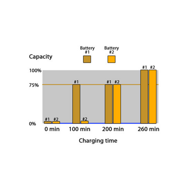 The 4-level LED charging indicators are provided for each channel which indicate the real time capacity by percentage when charging.