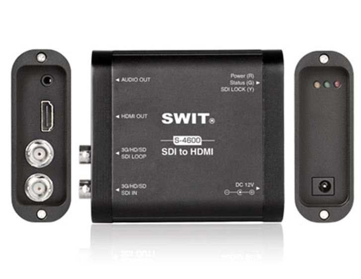 SWIT S-4600 je kompaktný prevodník 3G/HD/SD-SDI na HDMI® určený na zobrazenie vysielaného SDI videa na zariadeniach HDMI®, ako sú televízory, LED obrazovky a projektory, s podporou vloženia zvuku a priechodného zapojenia.