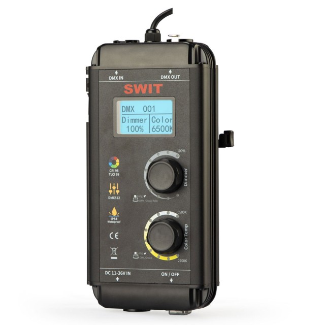 Ovládač svetla SL-150P poskytuje gombíky na ovládanie stmievania a teploty farieb, LCD displej, V-mount batériovú dosku, 11-36V široký rozsah 4-pinového XLR DC IN, 5-pinový XLR DMX IN a OUT a 5V USB výstup pre bezdrôtový DMX adaptér.