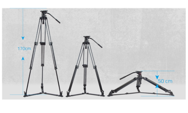Stativ má 3-dielnu konštrukciu nôh, ktoré sa dajú nastaviť od 50 cm do 170 cm pomocou jedného systému uvoľnenia a uzamknutia pracky, a ponúka univerzálne ovládanie výšky pre rôzne uhly snímania. Integrovaná fluidná hlava zabezpečuje plynulý pohyb v smere pan a tilt s nastaviteľným tlmením pre presný pohyb kamery. Hlava umožňuje otáčanie v smere pan o 360° a naklápanie v smere tilt od -75° do +90°, zatiaľ čo svietiaca vodováha zabezpečuje presné vyrovnanie.