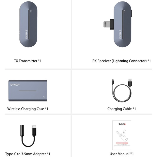 Spoločnosť SYNCO po prvýkrát oznámila nabíjacie puzdro pre nahrávací mikrofón. S týmto puzdrom je nabíjanie také jednoduché ako vloženie vysielača do puzdra. Červená kontrolka na vysielači vás informuje o tom, že sa nabíja. Prijímacia strana je napájaná z telefónu.