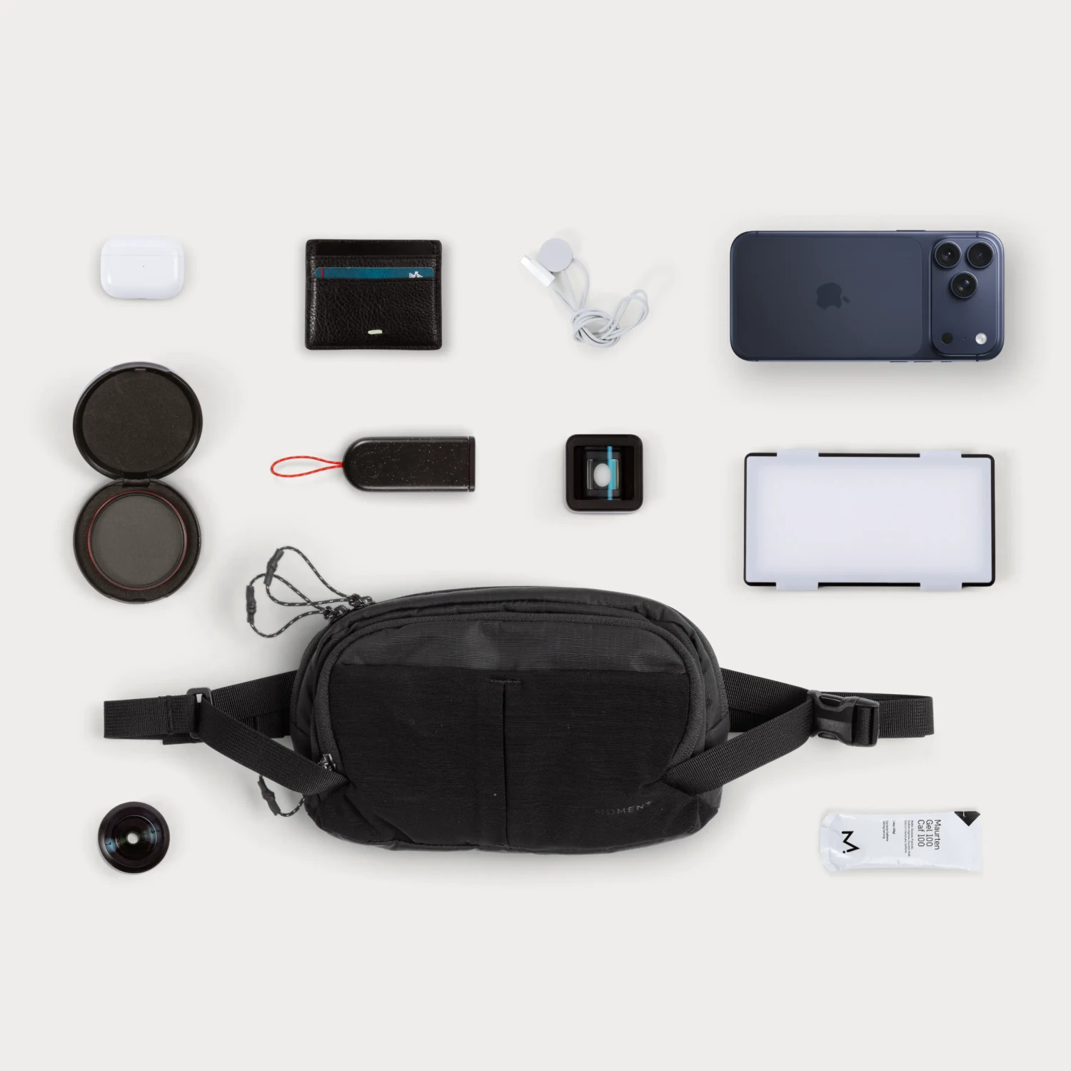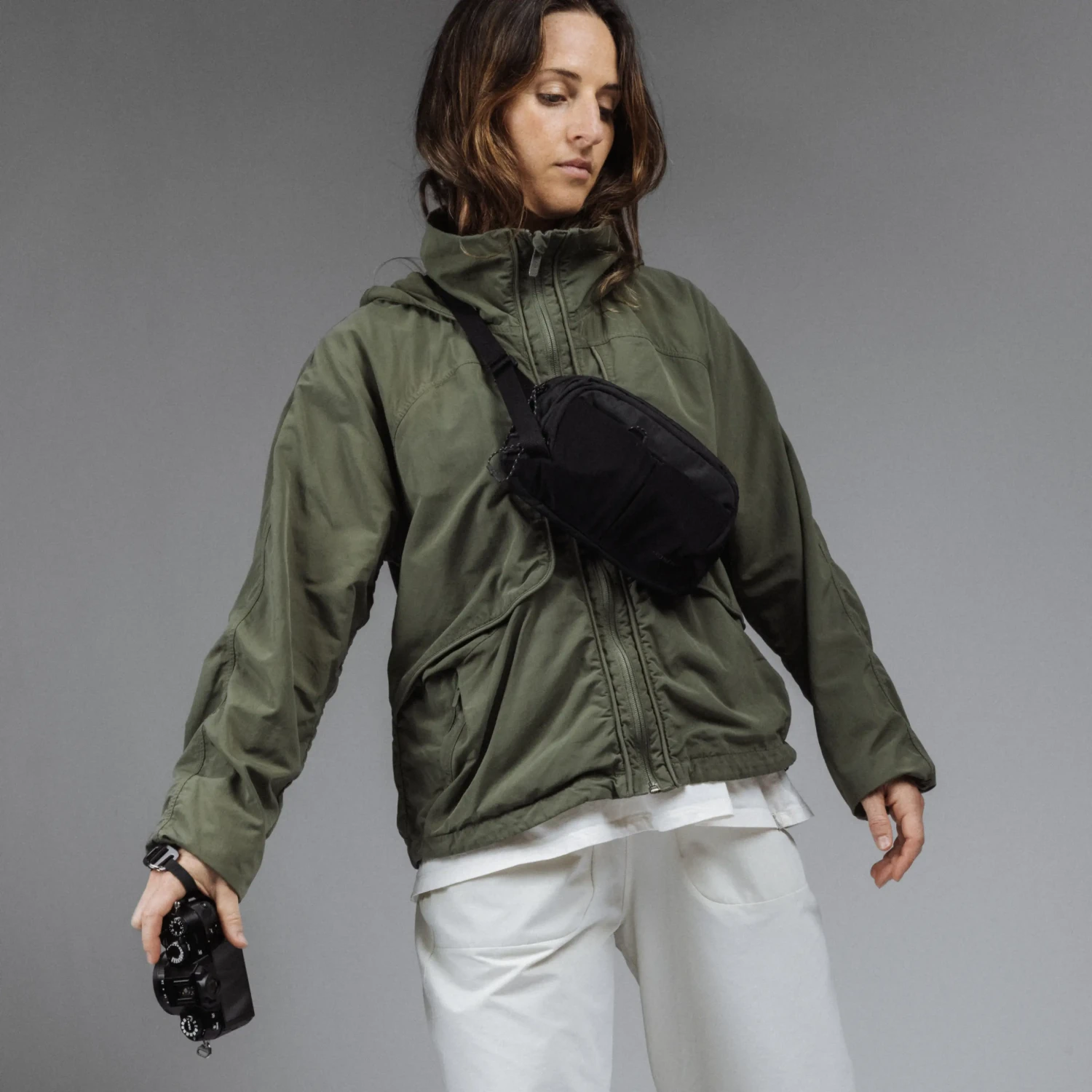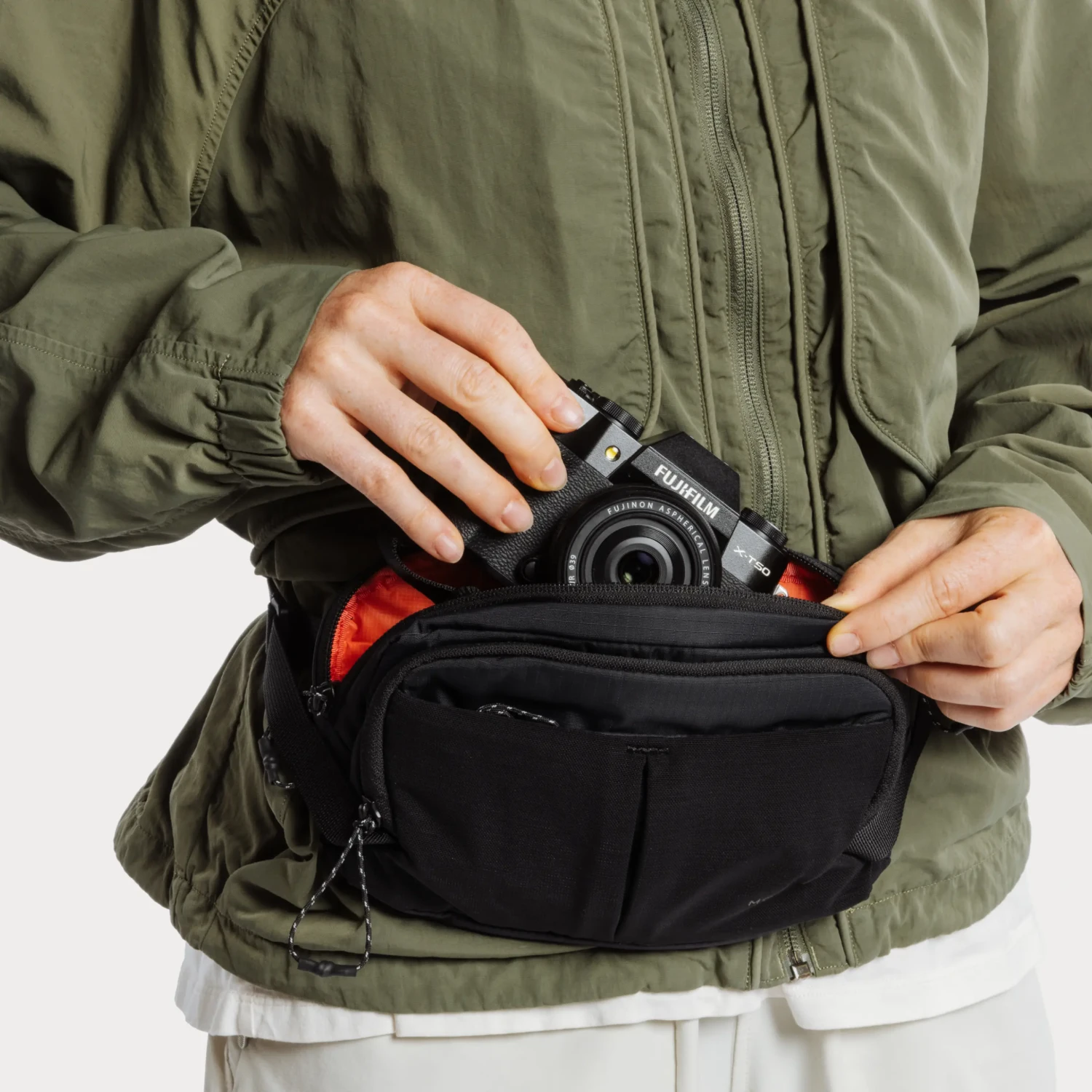 Navrhnutá ako taška na rýchly prístup na opasok alebo minimalistická taška cez rameno, ktorú možno nosiť pod alebo nad oblečením. Širší tvar a ľahká konštrukcia sa prispôsobujú pásu a pohodlne sedia v oblasti bedrovej chrbtice.