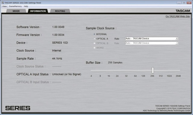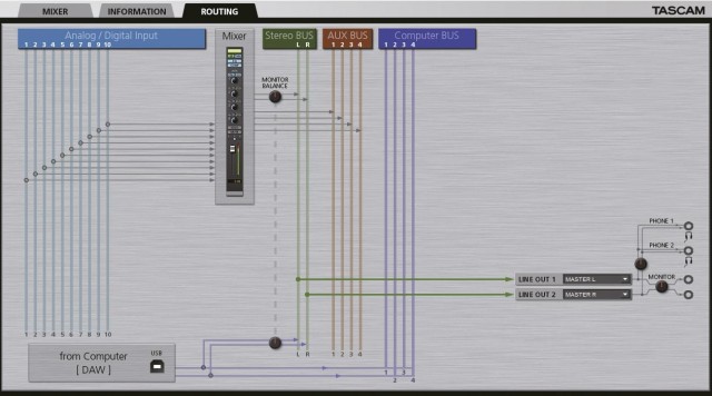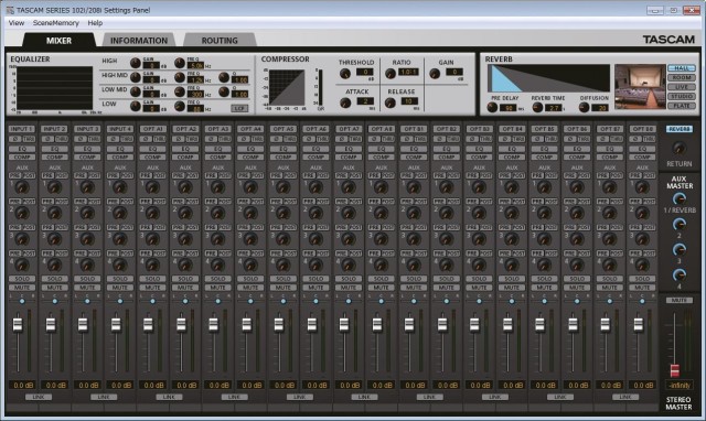 Bezplatný, ľahko použiteľný softvér Tascam Control spravuje fadery, spracovanie a možnosť smerovať akýkoľvek zvukový vstup (analógový, optický a USB) na akýkoľvek zvukový výstup.
