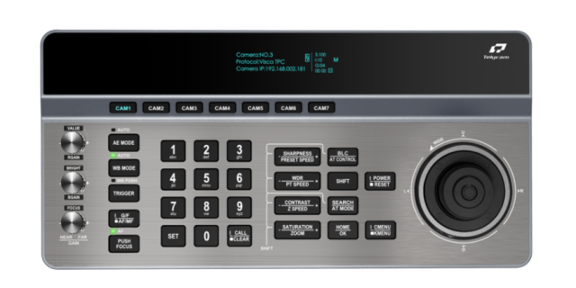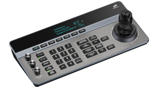 Vstavaný 3,12-palcový OLED displej poskytuje jasnú spätnú väzbu v reálnom čase o stave kamery a nastaveniach ovládania. Ergonomické rozloženie oddeľuje numerické a funkčné ovládacie prvky pre intuitívne ovládanie, zatiaľ čo klávesové skratky umožňujú rýchle prepínanie medzi kamerami. Možnosti pripojenia zahŕňajú Ethernet s podporou PoE, rozhrania RS232, RS422 a RS485, čo zaisťuje kompatibilitu s širokou škálou profesionálnych PTZ kamier.