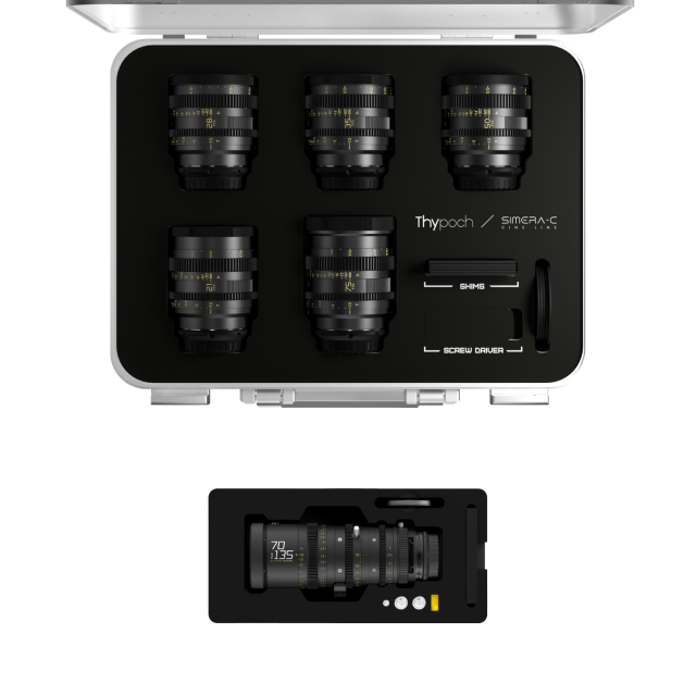 Sada prémiových objektívov Thypoch Simera-C s pevnou ohniskovou vzdialenosťou + zoom objektív DZOFILM Catta Zoom 70-135 mm. Celkový rozsah ohniskovej vzdialenosti 21–135 mm pokrýva rôzne kreatívne potreby.