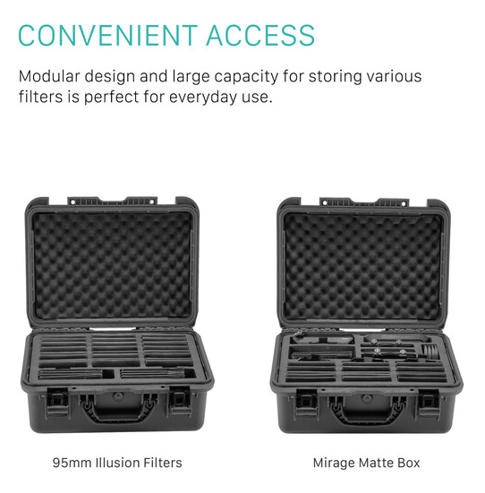 Tilta MB-T16-FCC poskytuje profesionálnu ochranu v kompaktnom prevedení, ktoré je vhodné na prepravu v lietadle. Presne vyrezaný vnútorný priestor z peny bezpečne pojme dvanásť samostatných 95 mm kruhových filtrov Illusion (alebo akúkoľvek kombináciu 3-balení a 4-balení predávaných spoločnosťou Tilta) a dva sloty pre 4×5,65″ obdĺžnikové filtre. Puzdro je vyrobené z vysoko odolného polypropylénu s nerezovými kovovými časťami, je úplne vodotesné (pri uzavretí má stupeň krytia IP67), odolné voči prachu, má vystužené rohy, tlakový ventil a pevné zámky. Pohodlná skladacie rukoväť uľahčuje prenášanie na pľaci alebo kontrolu pri cestovaní. S hmotnosťou iba 4,5 kg v prázdnom stave ponúka dokonalú rovnováhu medzi kapacitou a prenosnosťou pre kameramanov, ktorí potrebujú mať svoju kompletnú sadu filtrov Mirage chránenú a vždy pripravenú.