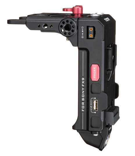 ES-T18-BTP3-V, navrhnutý na mieru pre systém Tilta FX9 cage, nahrádza štandardnú dosku fotoaparátu čistým, plne integrovaným riešením V-Mount, ktoré dokonale prilieha k zadnej časti FX9. Jedna batéria V-Mount s kapacitou 98–190 Wh napája celé zariadenie prostredníctvom rozsiahlych regulovaných výstupov: tri porty D-Tap 14,8 V, dva 2-pinové výstupy LEMO 14,8 V, jeden USB-A 5 V a 6-pinový vstup LEMO DC (12–28 V), ktorý prijíma adaptéry striedavého prúdu alebo blokové batérie pre neprerušované napájanie. Krátky, integrovaný valcovitý kábel udržiava káblovanie upratané a konštrukcia z CNC hliníka udržuje hmotnosť na prijateľnej úrovni 900 g.