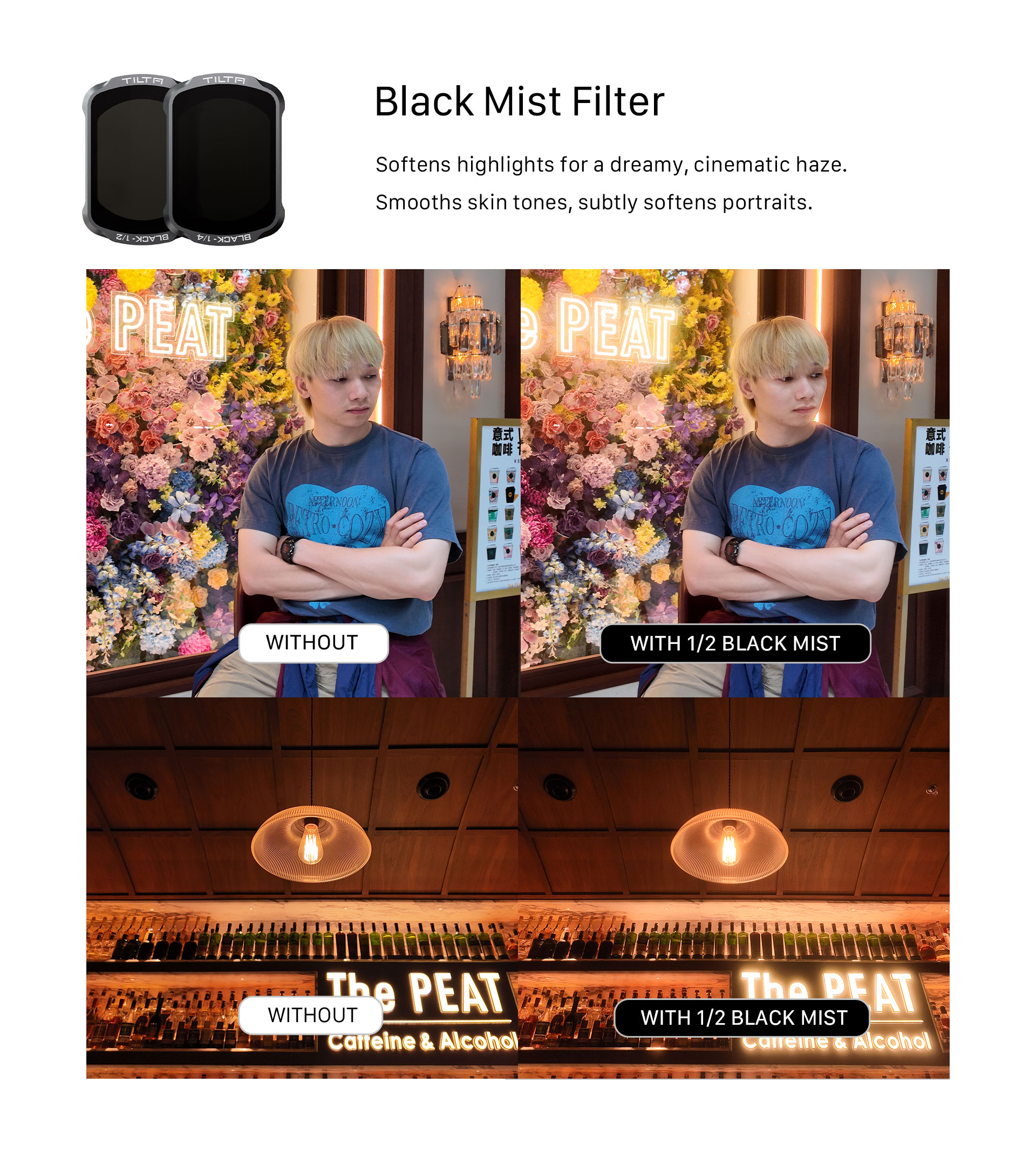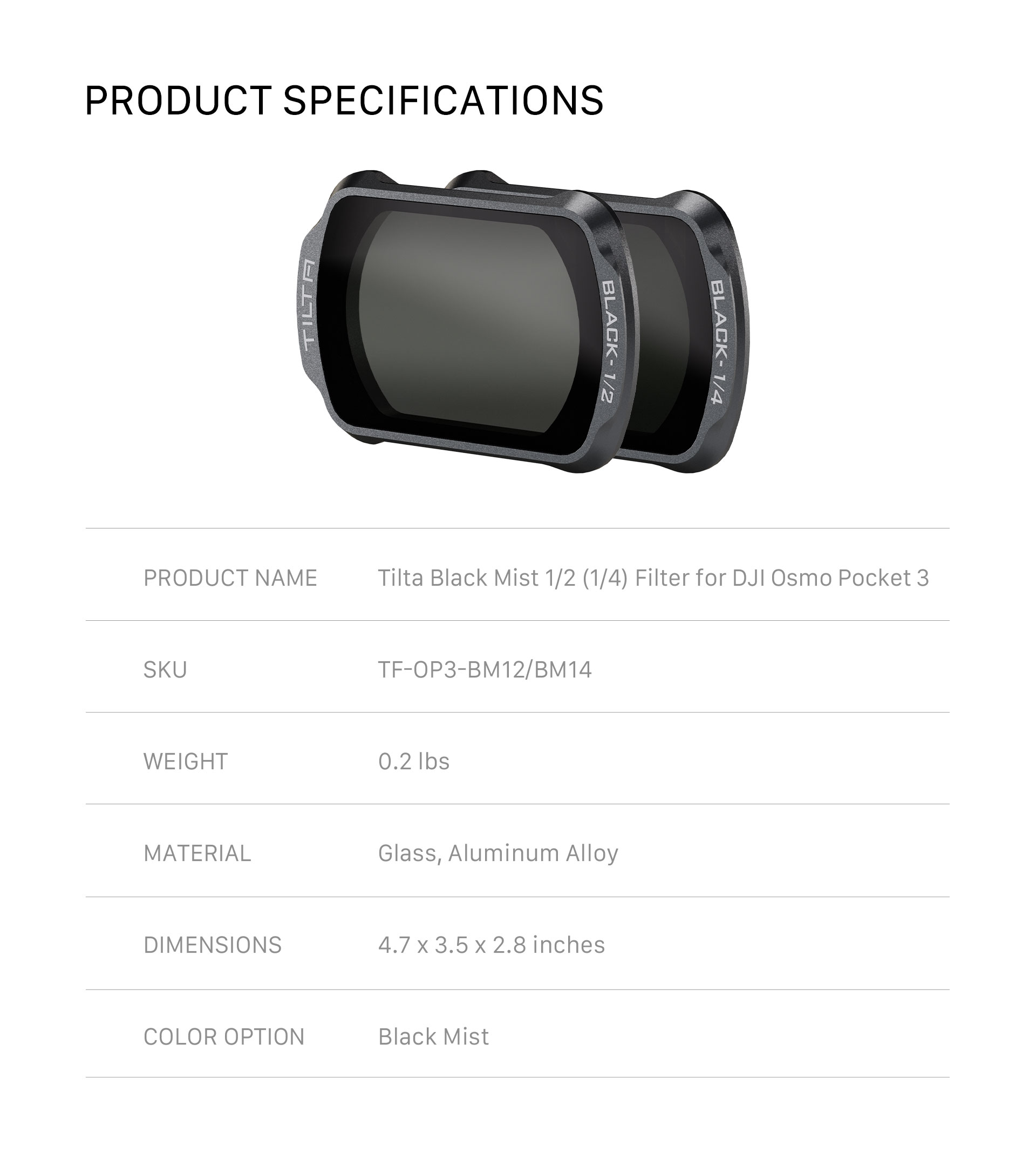 Filtre sú navrhnuté na mieru pre vrecká Pocket 3 a majú magnetické pripojenie na bezproblémové pripojenie, zatiaľ čo drážkovaný dizajn s rýchlym uvoľňovaním umožňuje rýchly prístup, ktorý sa dá odstrániť stlačením. Tento filter je typom difúzneho filtra, ktorý znižuje kontrast a vytvára jemnú žiaru okolo zdrojov svetla, pričom obmedzuje celkovú mäkkosť a zachováva kontrast v tieňoch.