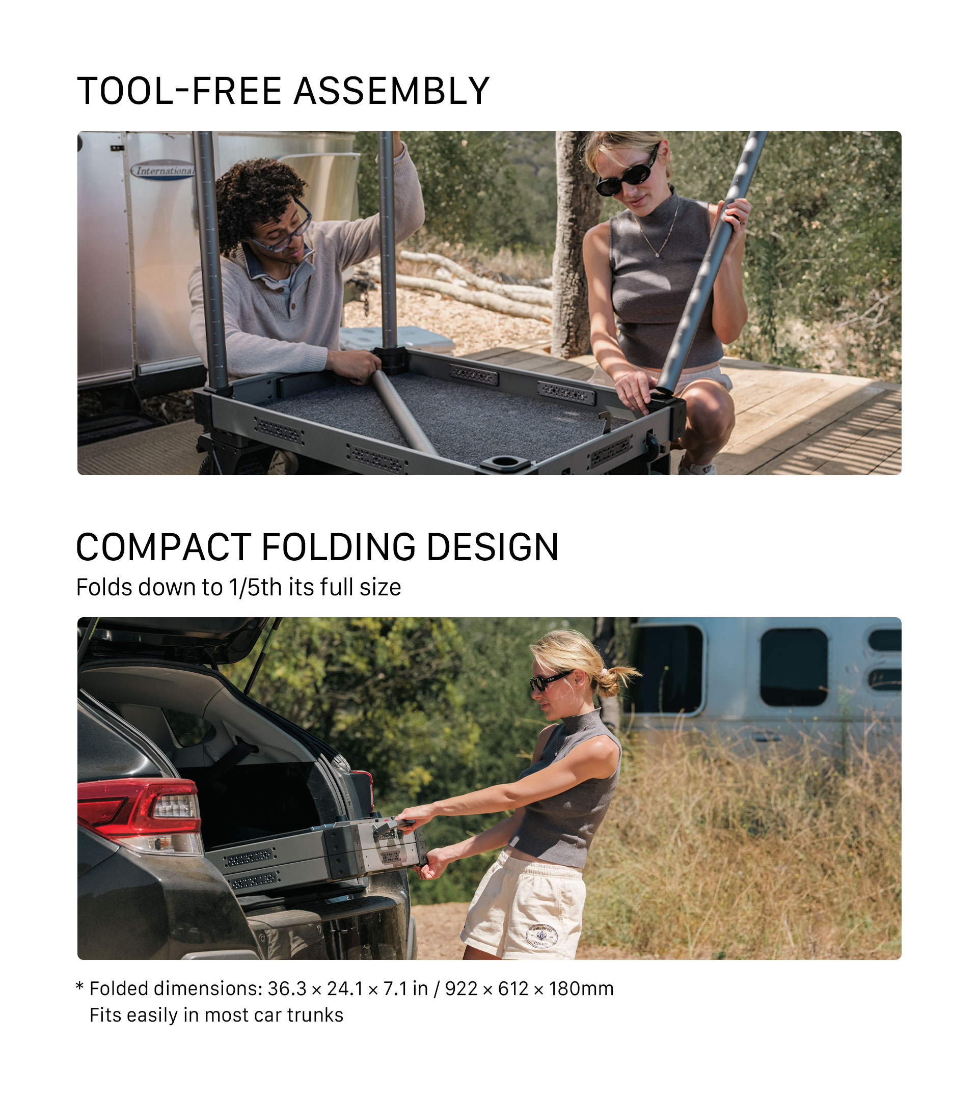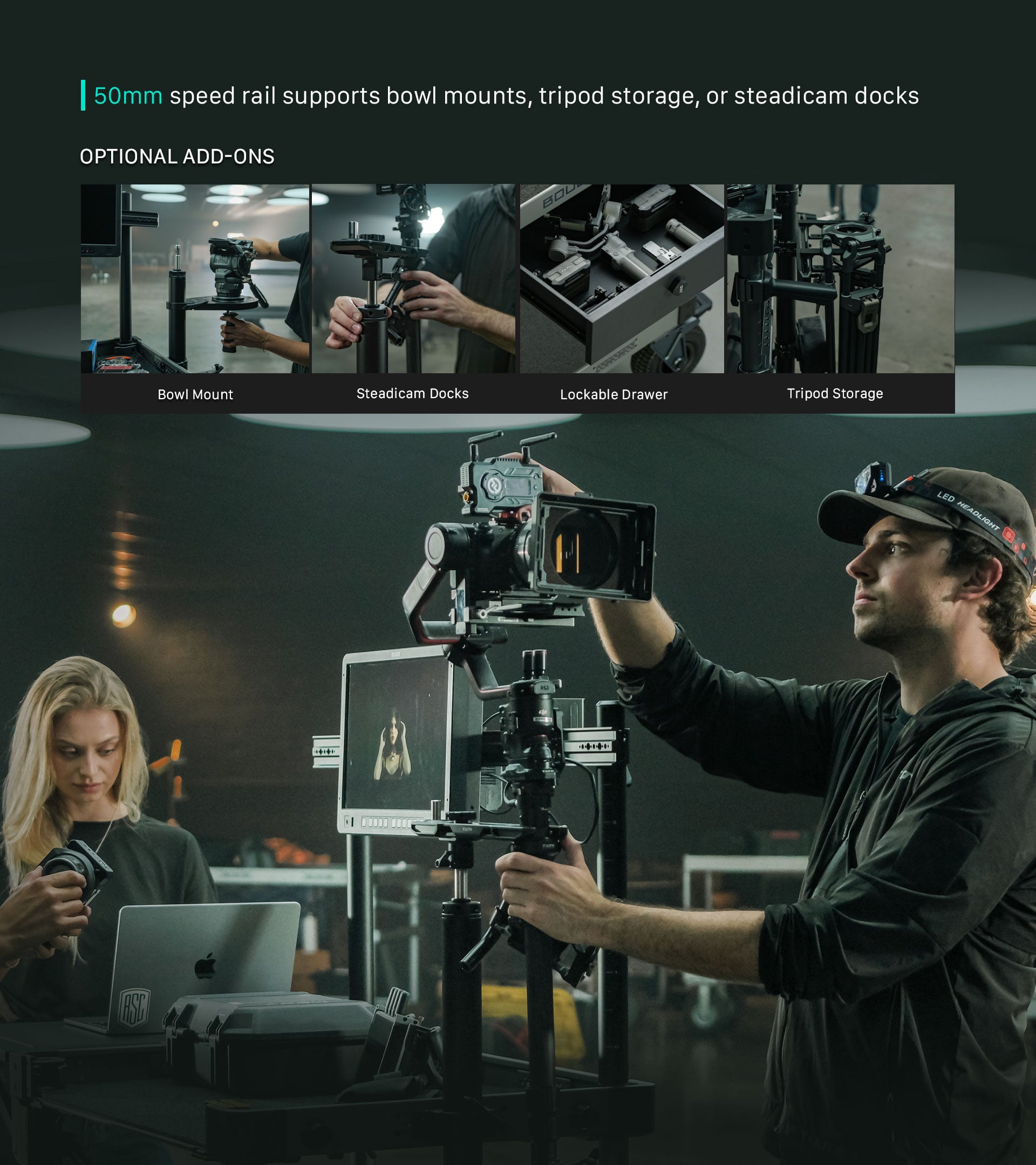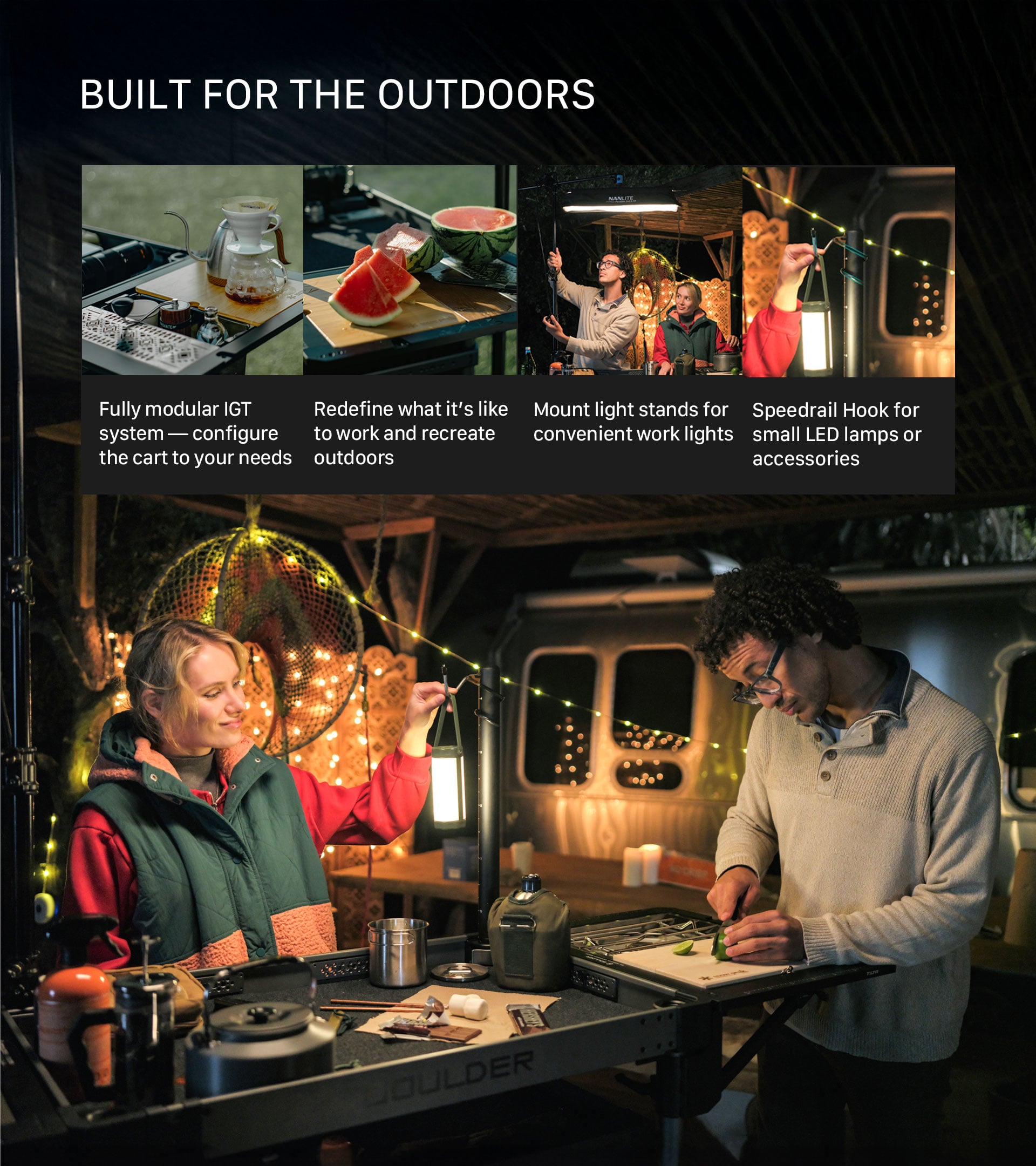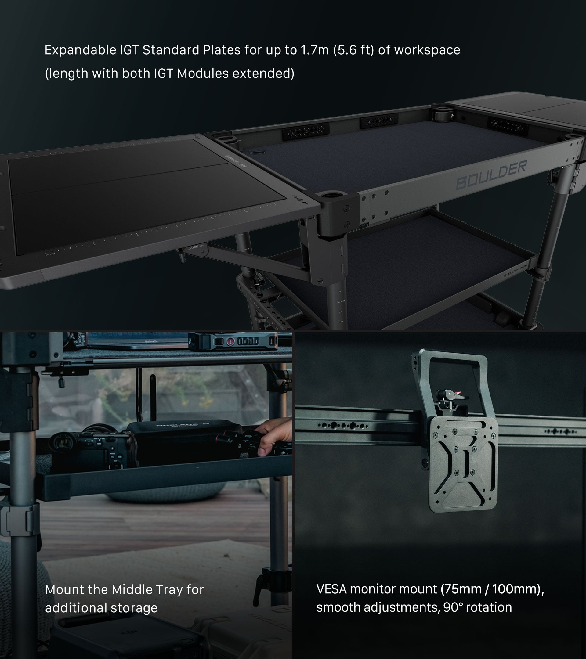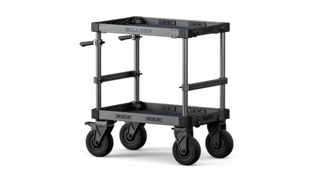 Boulder je navrhnutý s dôrazom na univerzálnosť a pohodlie a je vybavený systémom rýchleho uvoľnenia bez použitia náradia, ktorý umožňuje jeho jednoduchú montáž alebo demontáž za pochodu – ideálny pre rýchle natáčanie alebo život na cestách. Keď sa vozík nepoužíva, horná a spodná časť sa spoja a vytvoria bezpečný pevný kufrík, ktorý uzamkne komponenty vo vnútri. Integrovaná rukoväť a malé vstavané kolieska premenia rozloženú jednotku na pojazdný kufrík, vďaka čomu je preprava medzi lokalitami bez námahy a ľahko sa naloží do menších vozidiel.