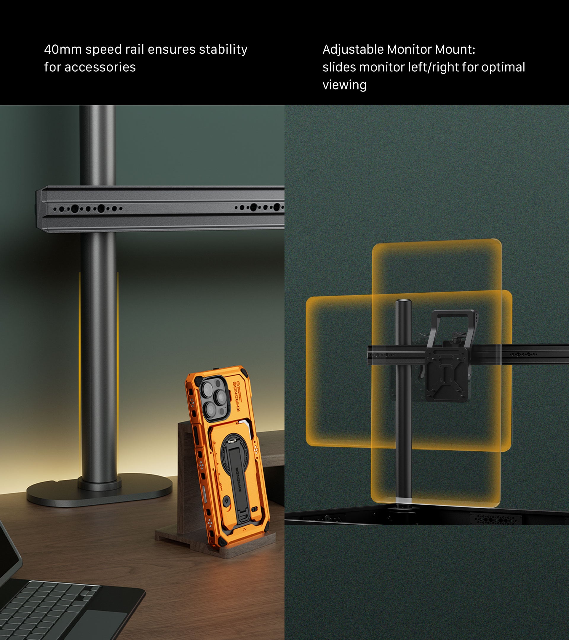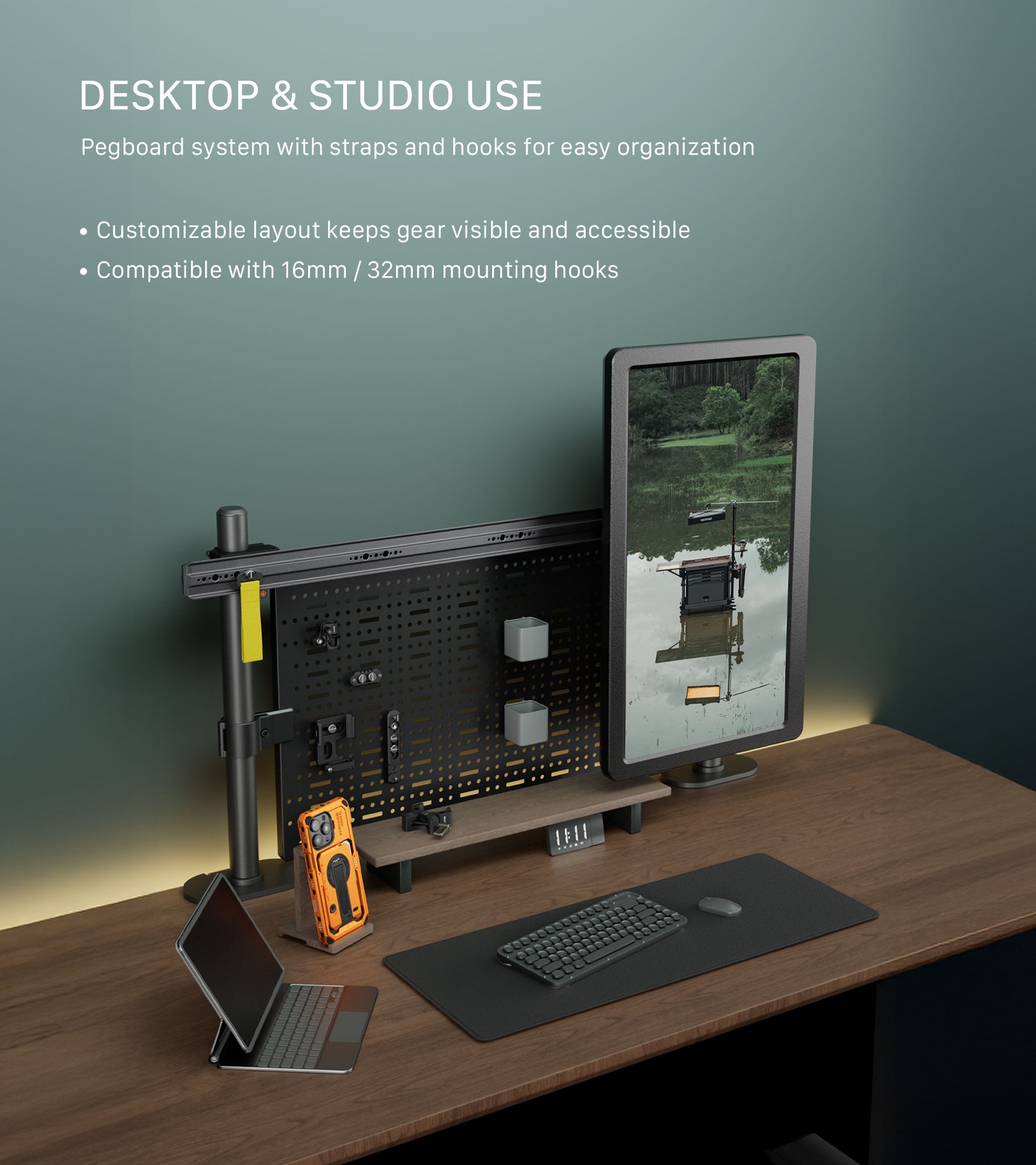 Vozík Boulder je vyrobený z odolného hliníka a ponúka viacero možností upevnenia, vrátane závitov 1/4″-20 a 3/8″-16 s polohovacími bodmi, čo umožňuje úplné prispôsobenie pomocou voliteľného príslušenstva. Či už potrebujete pripojiť ramená monitorov, stojany na náradie alebo iné podporné zariadenia, tento vozík sa prispôsobí vášmu pracovnému postupu.