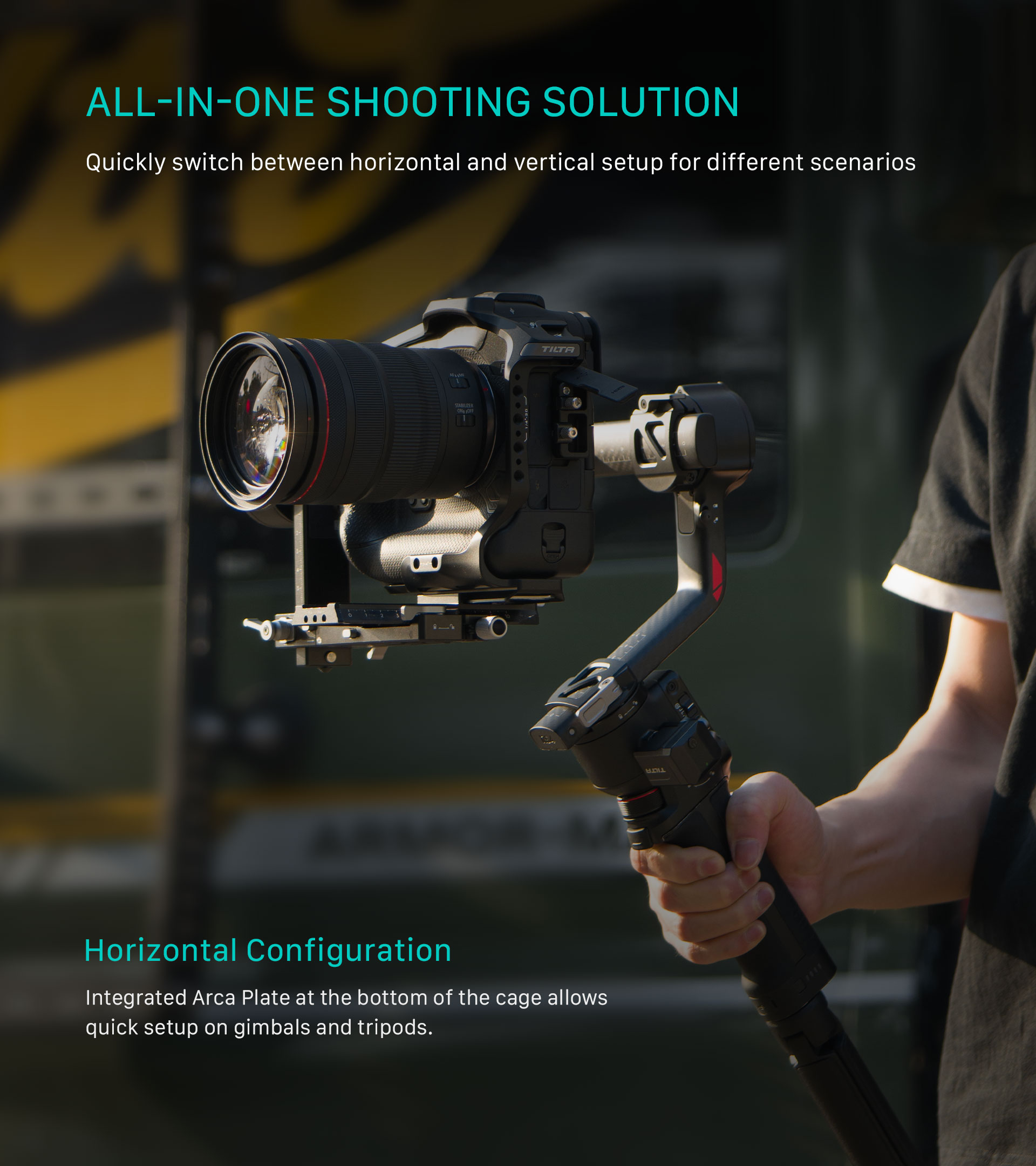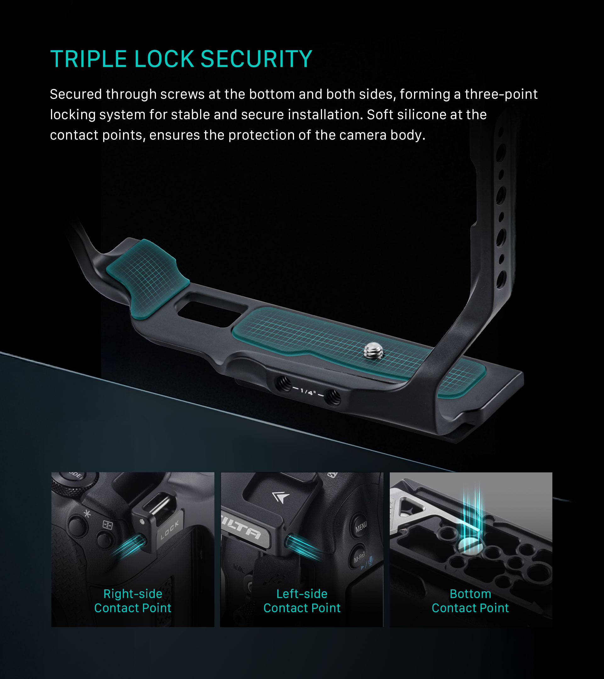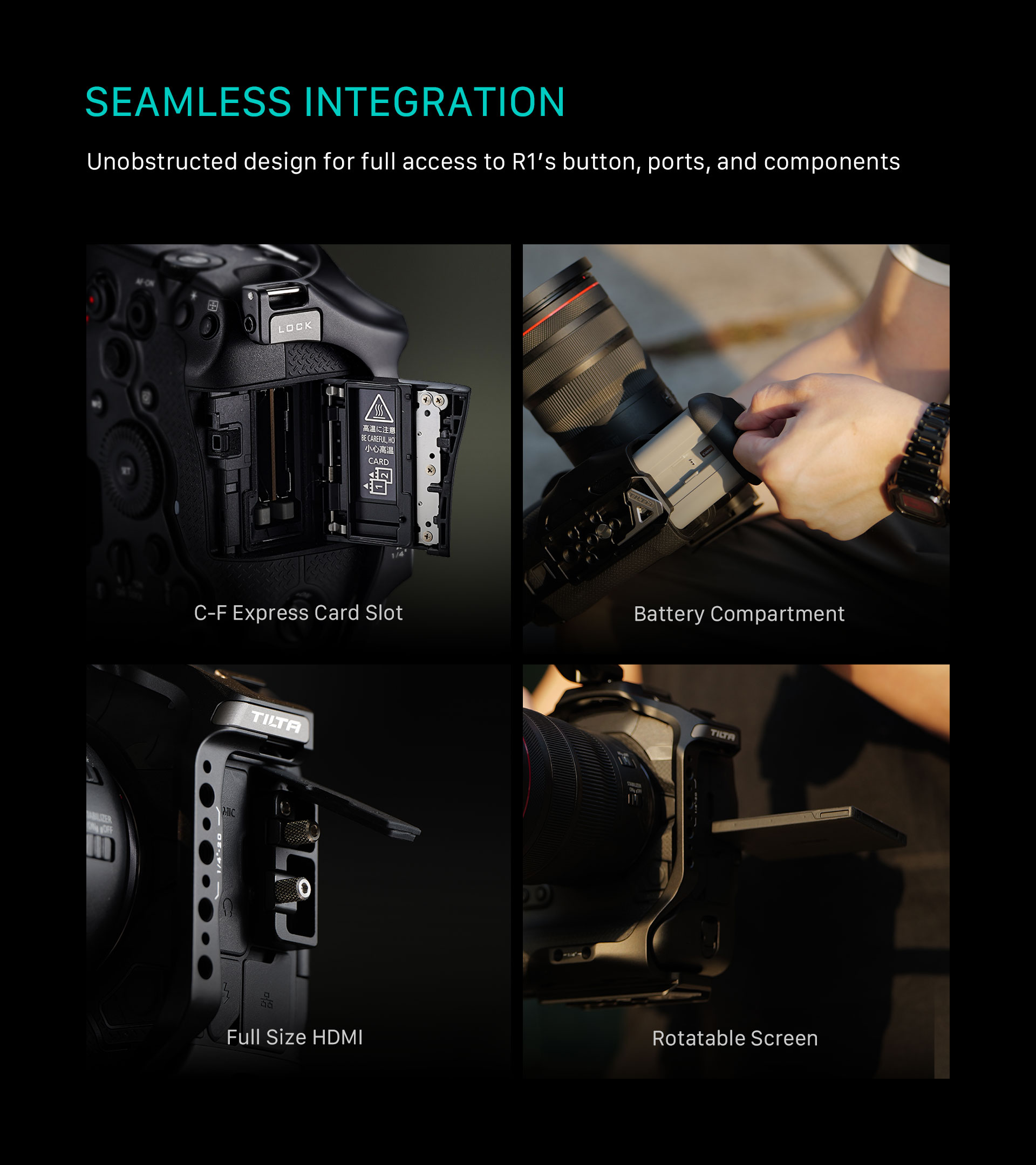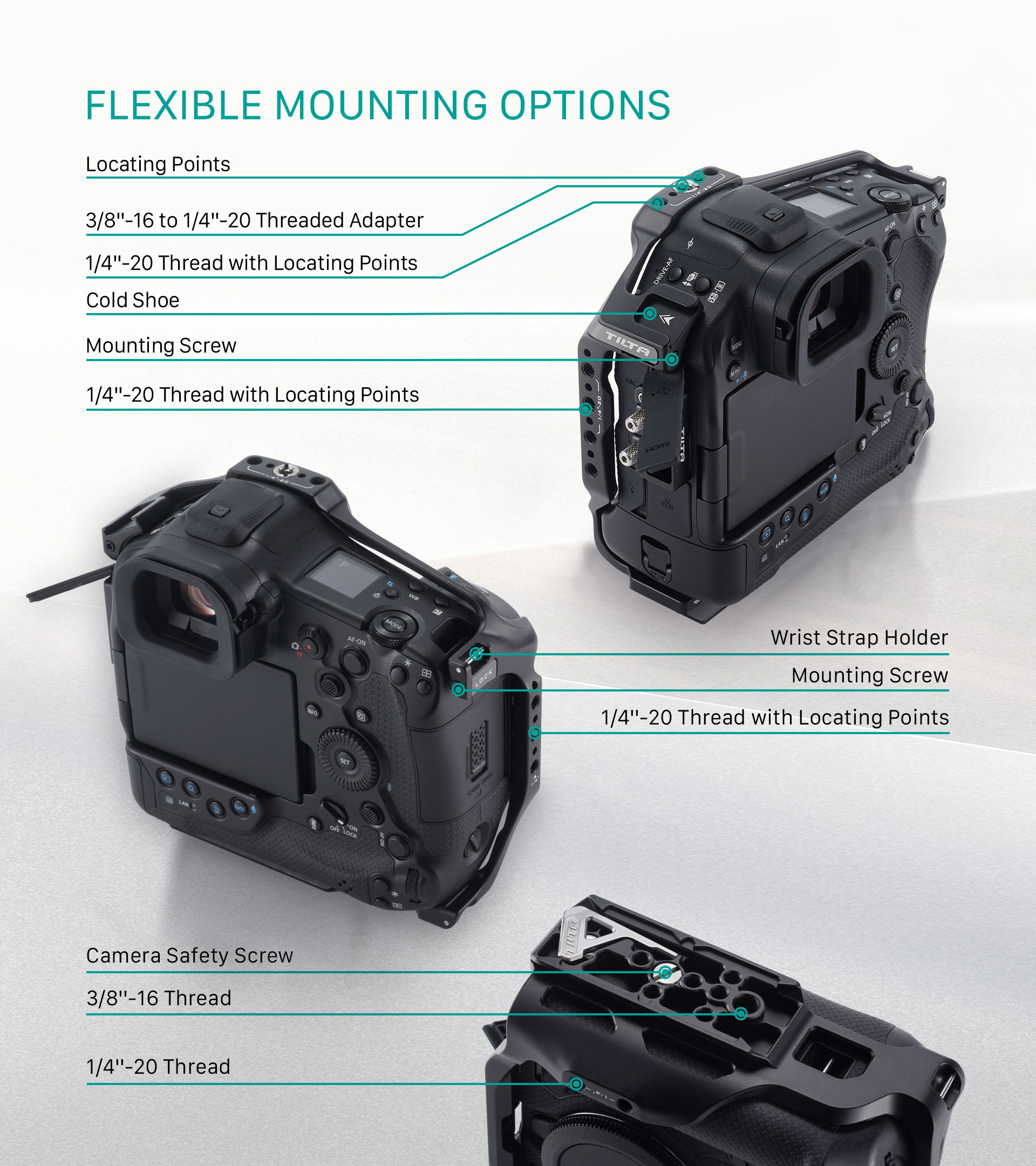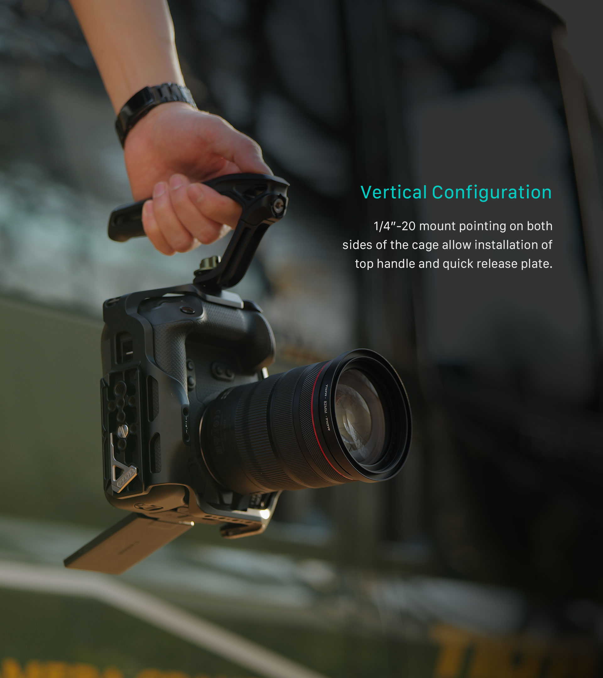 Predstavujeme základnú súpravu klietky fotoaparátu pre Canon R1. Poskytuje dodatočnú ochranu tela fotoaparátu a zároveň rozširuje možnosti montáže rôzneho príslušenstva. Táto kompletná klietka na fotoaparát obsahuje prijímač studenej pätice, úchyty na zápästný remienok, závit 1/4″-20 s lokalizačnými bodmi a adaptér so závitom 3/8″-16 na 1/4″-20.