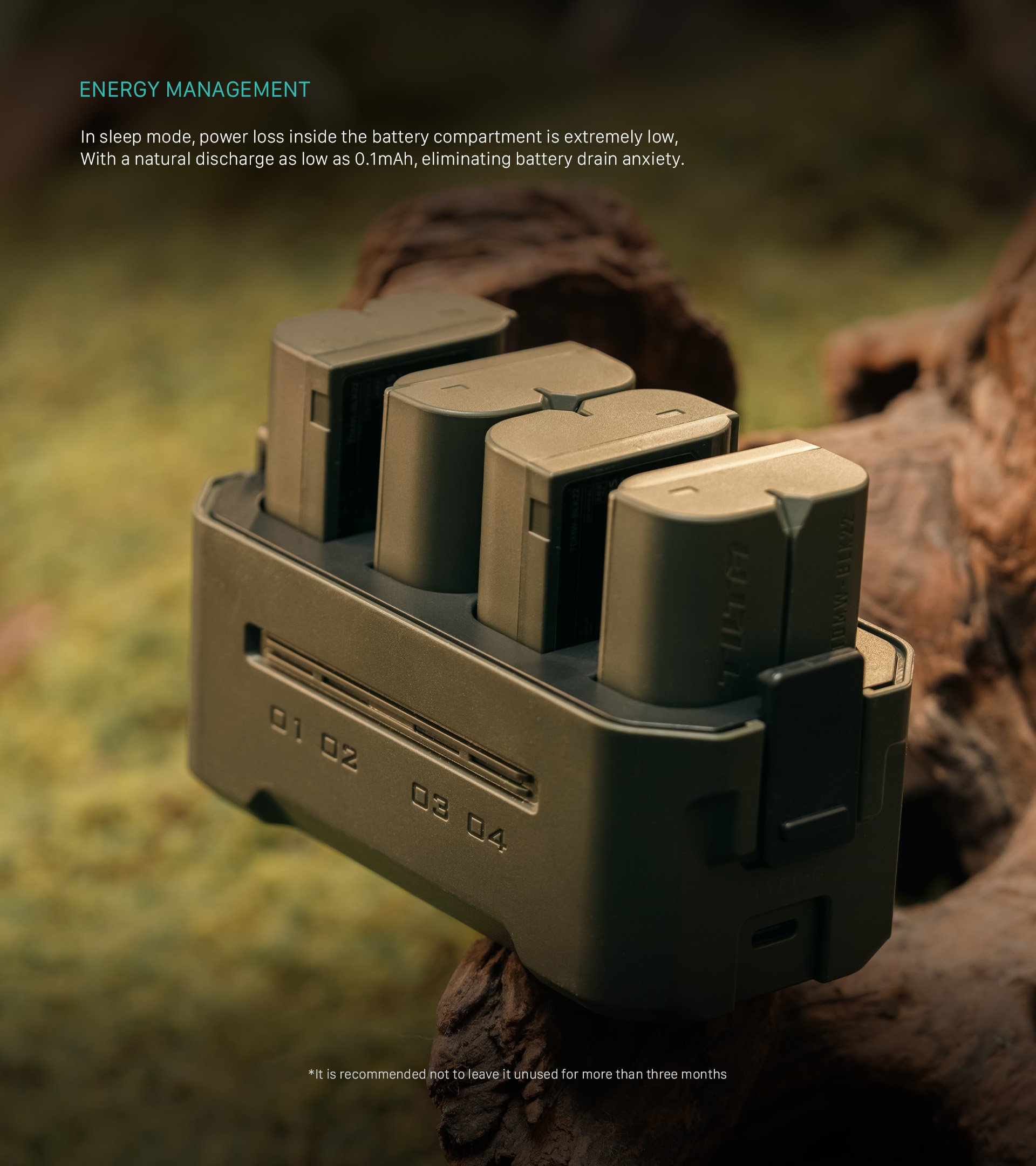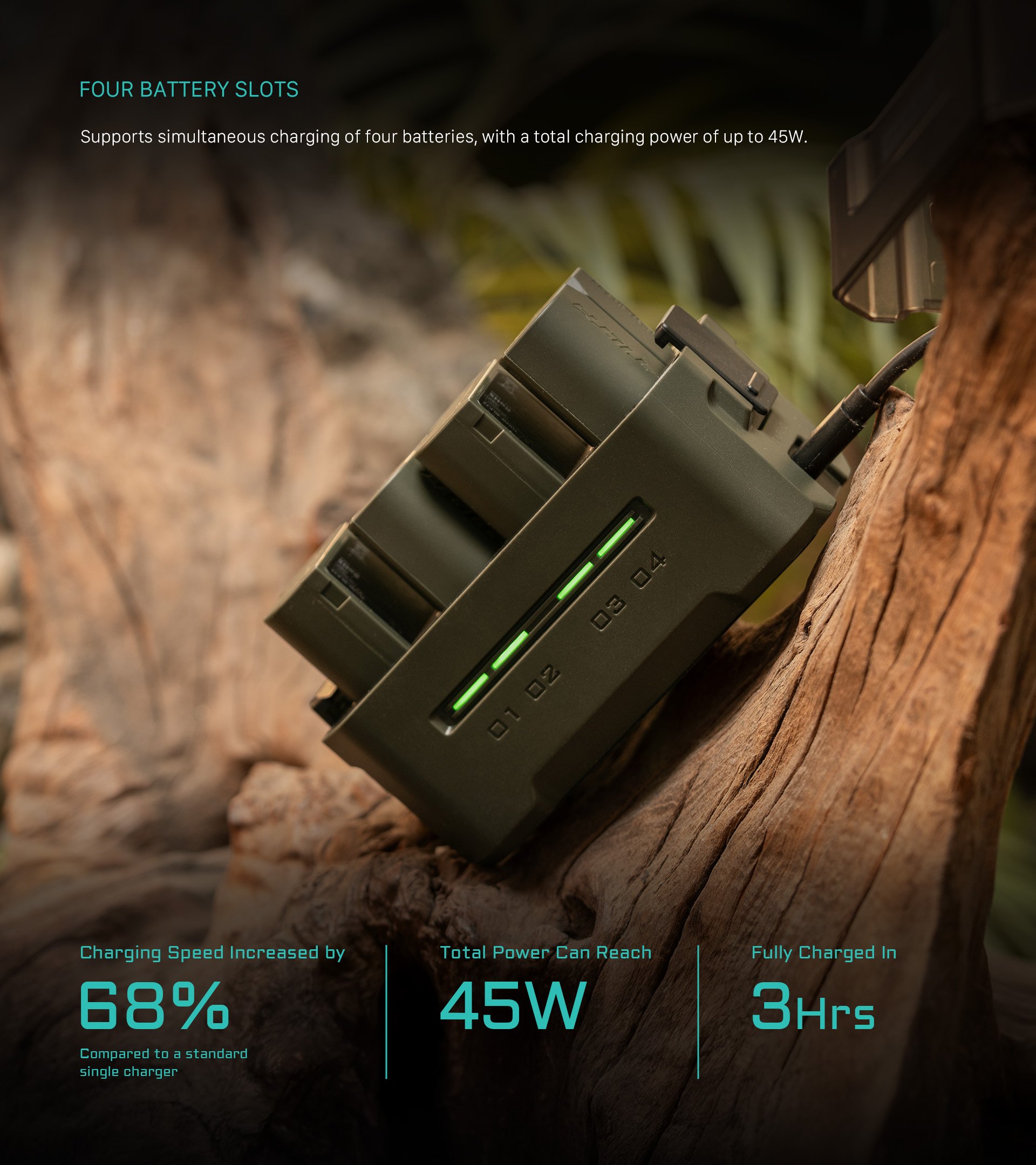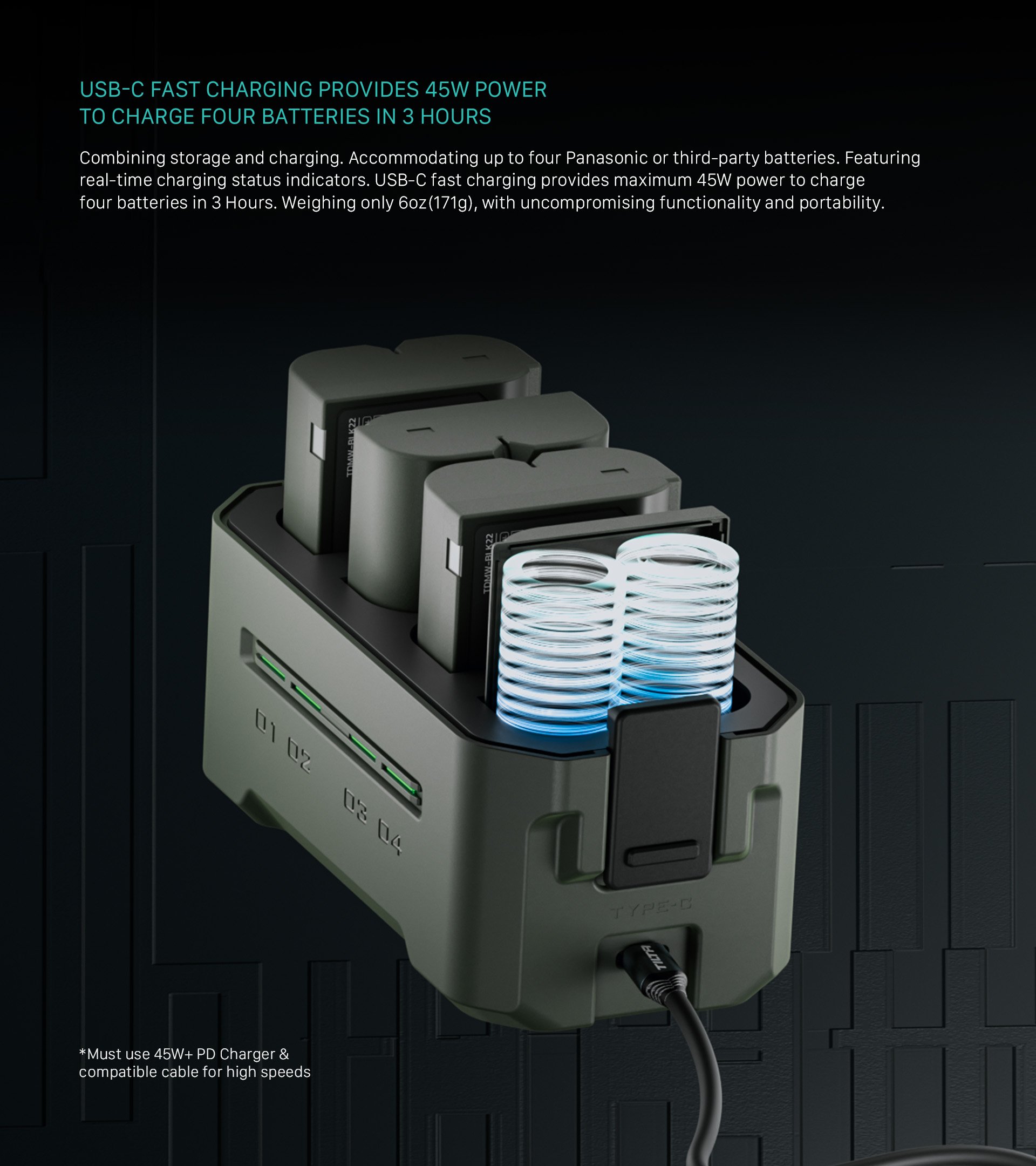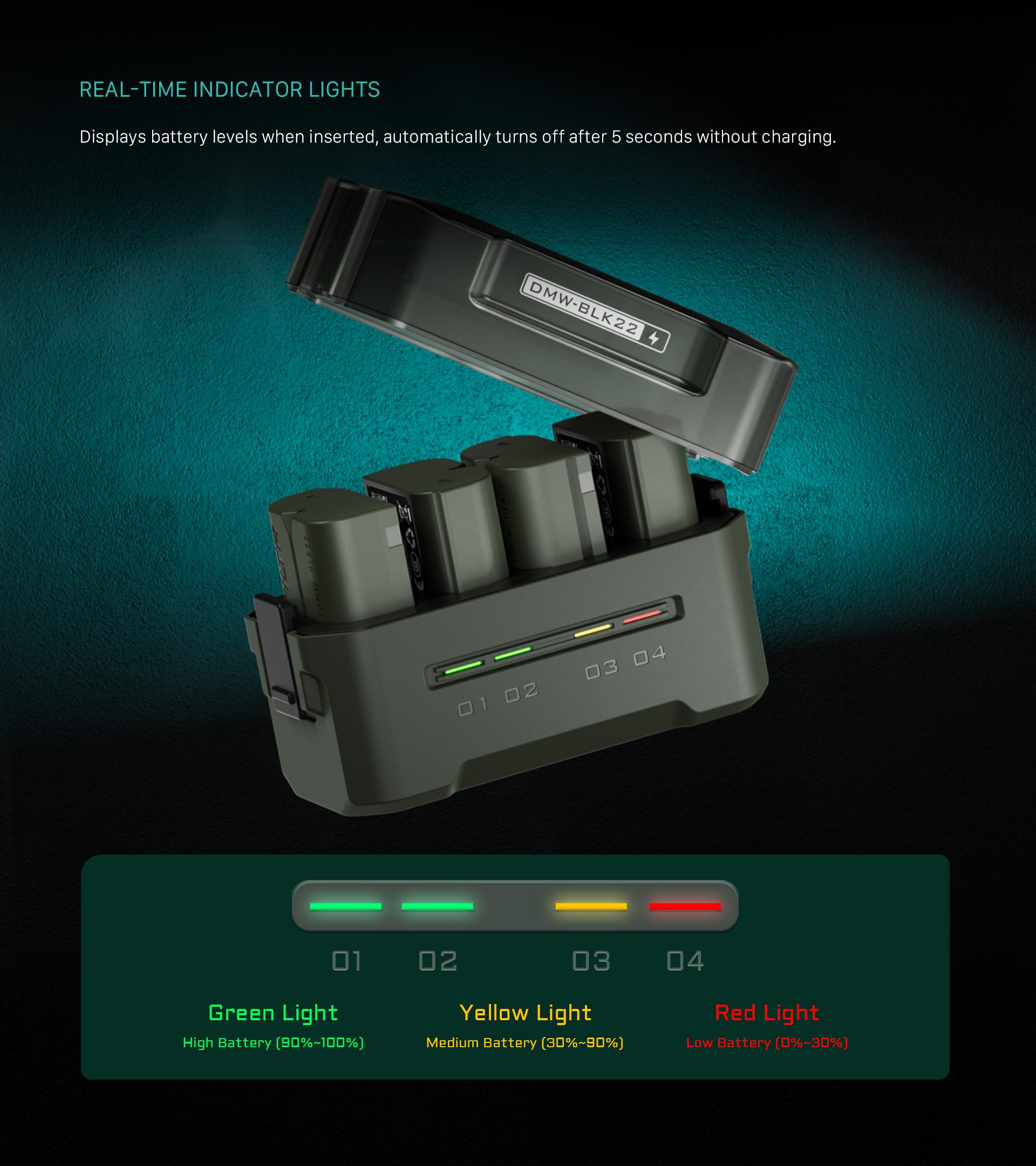 Táto kompaktná nabíjacia stanica je navrhnutá tak, aby podporovala batérie Panasonic a batérie DMW-BLK22 iných výrobcov, a ponúka štyri sloty na jednoduché nabíjanie a pohodlné skladovanie. Je vybavená rýchlym nabíjaním PD s výkonom 45 W a poskytuje o pôsobivých 68 % vyššiu rýchlosť nabíjania ako štandardná jednoduchá nabíjačka, vďaka čomu sú vaše batérie pripravené na akciu už za 3 hodiny.