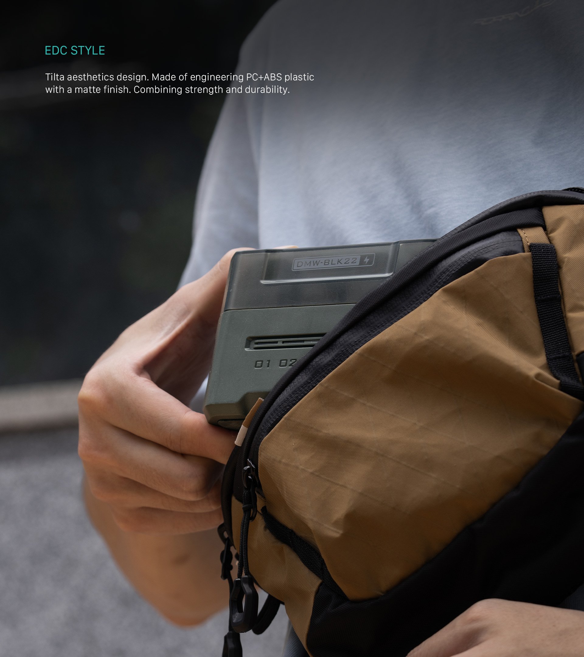 Prenosná nabíjacia stanica Tilta má dizajn v štýle EDC s charakteristickou estetikou značky Tilta, takže je štýlovým a funkčným doplnkom vašej výbavy.