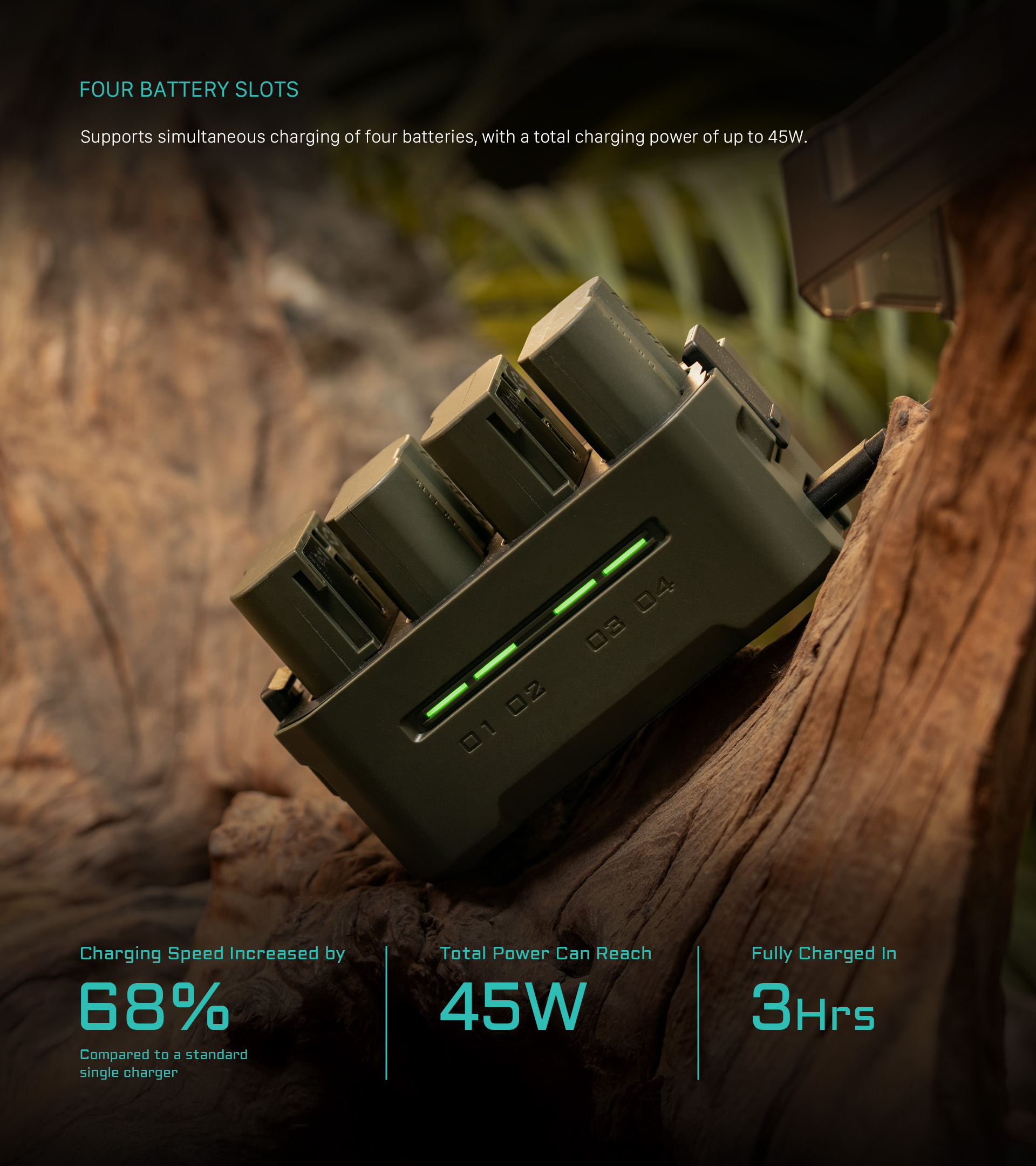 Táto kompaktná nabíjacia stanica je určená na podporu batérií EN-EL15C od spoločnosti Nikon a iných výrobcov a ponúka štyri sloty na jednoduché nabíjanie a pohodlné skladovanie.