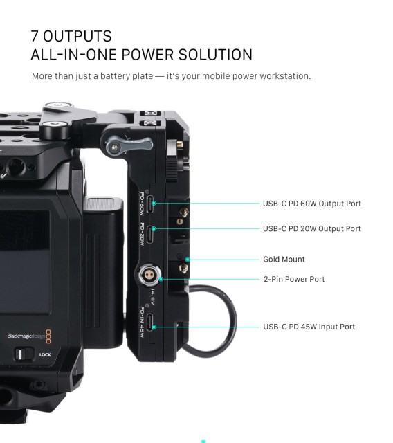 Táto batériová doska s rozhraním V-Mount sa pripája priamo na náš kamerový rám pre Blackmagic PYXIS 6K/12K a disponuje viacerými výstupnými portmi, ako sú PD USB-C, P-Tap a 2-pinový konektor, ako aj vstupom PD USB-C.