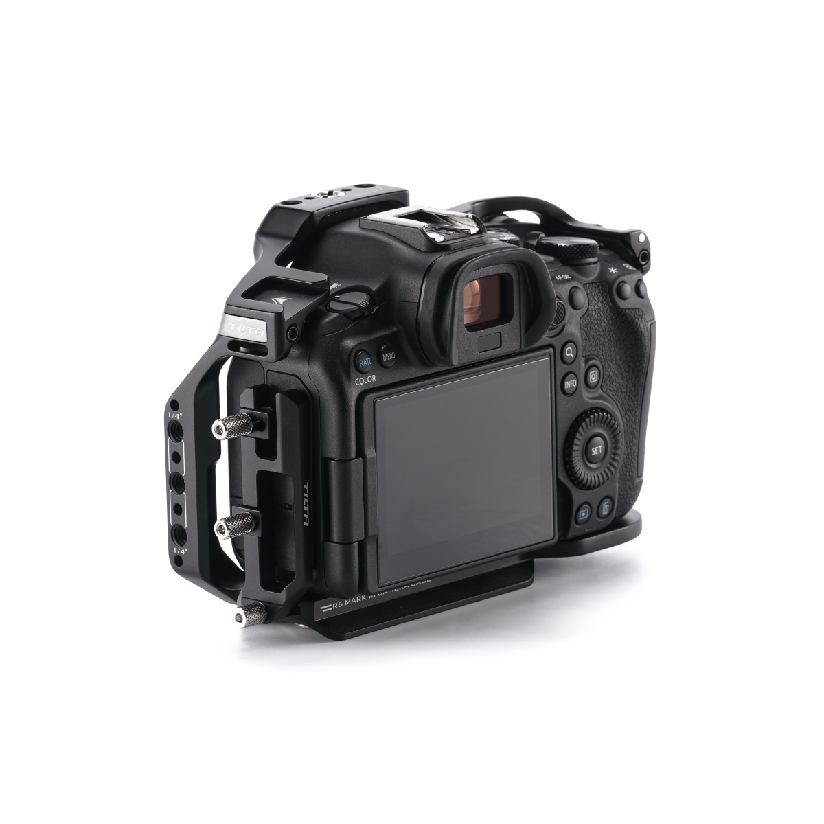 Tilta Full Camera Cage pre Canon R6 Mark III - čierna je presne navrhnutá ochranná konštrukcia špeciálne navrhnutá pre telá fotoaparátov Canon R6 Mark III a R5 Mark II. Poskytuje komplexnú ochranu a zároveň zachováva plný prístup ku všetkým portom, priestoru pre batériu a ovládacím prvkom. Konštrukcia je vyrobená z vysoko pevnej hliníkovej zliatiny s protišmykovou silikónovou výstelkou, ktorá absorbuje nárazy a zabraňuje opotrebeniu tela fotoaparátu pri náročnom používaní.