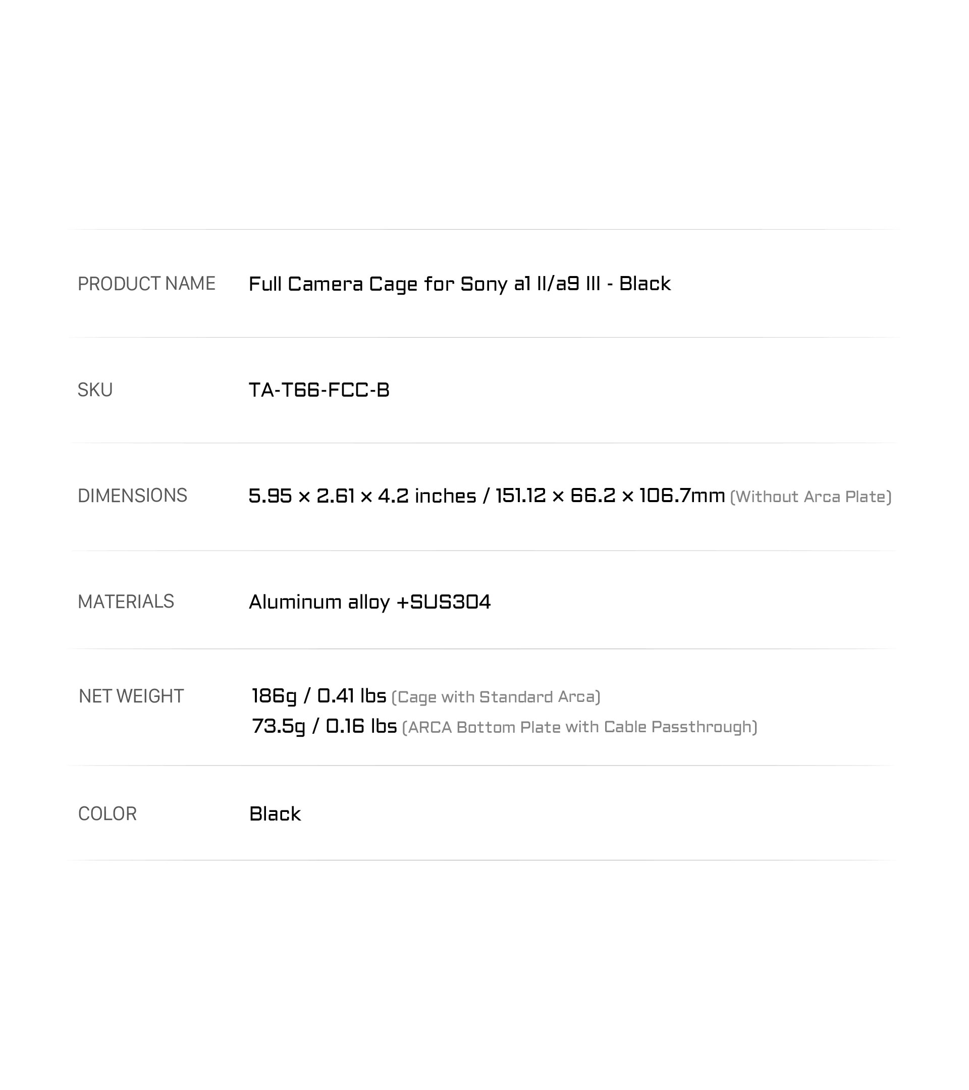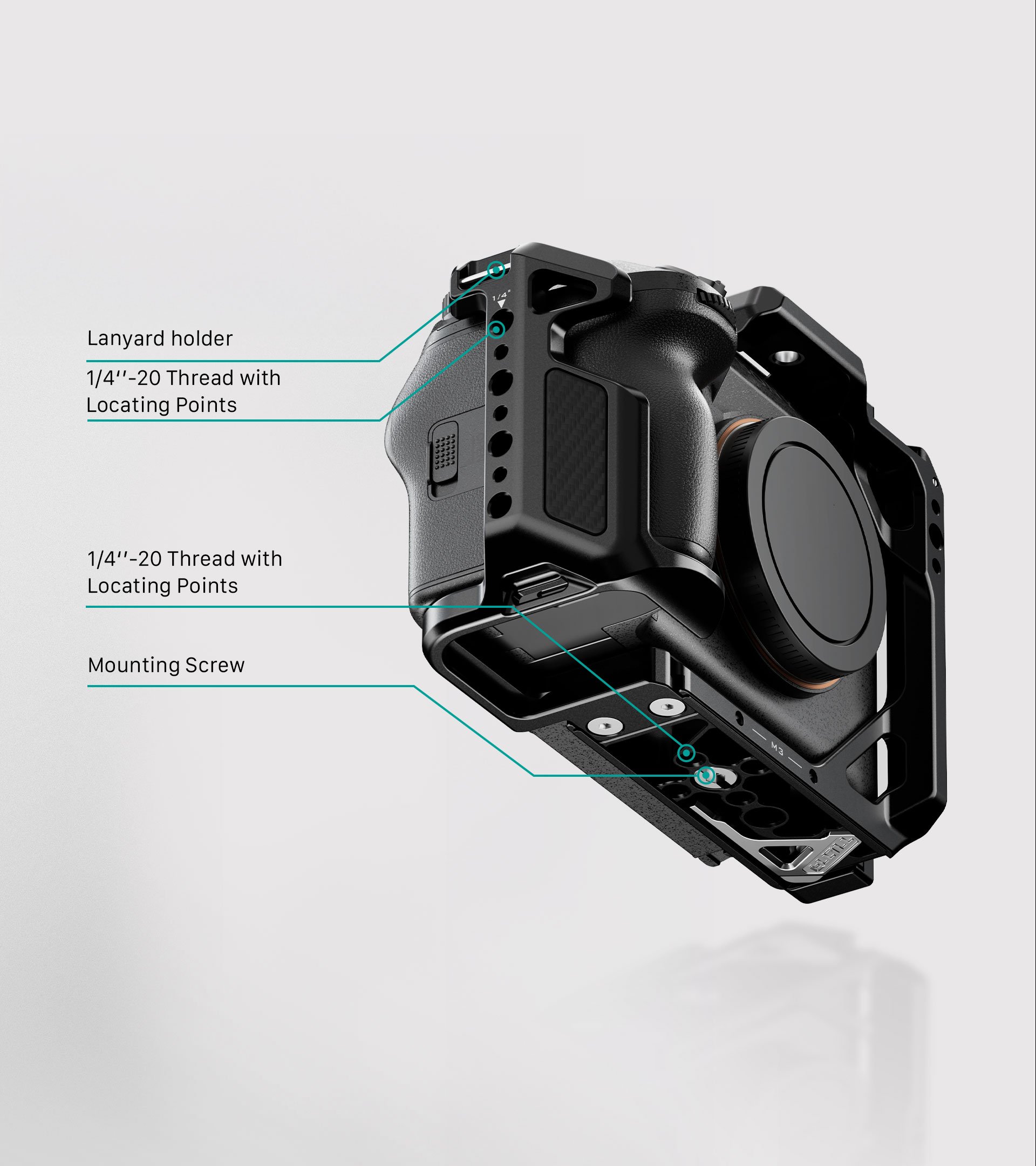 Klietka Full Cage je vybavená prijímačom Cold Shoe, závitom M3, závitom 1/4″-20 s lokalizačnými bodmi a adaptérom so závitom 3/8″-16 na 1/4″-20.