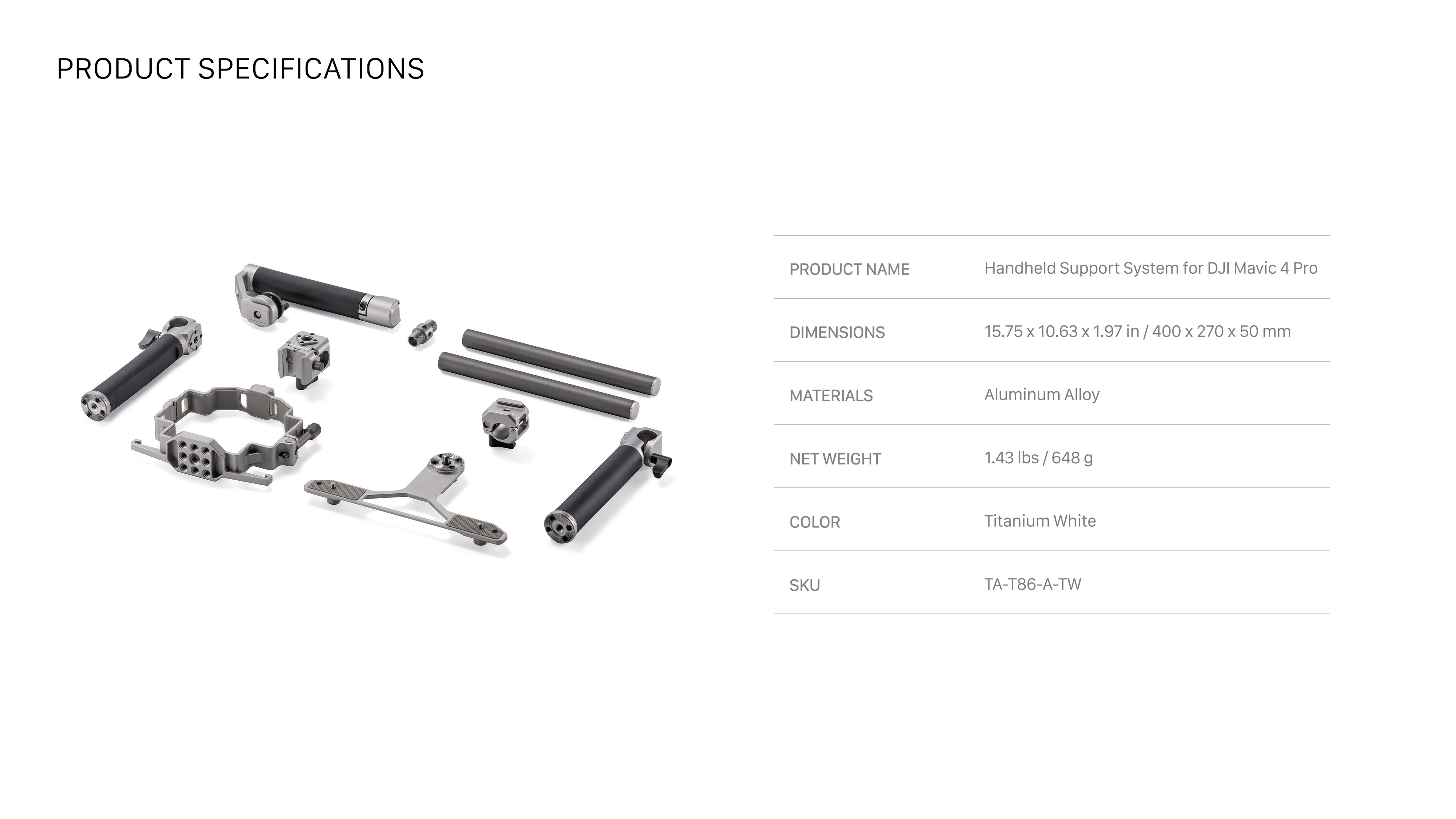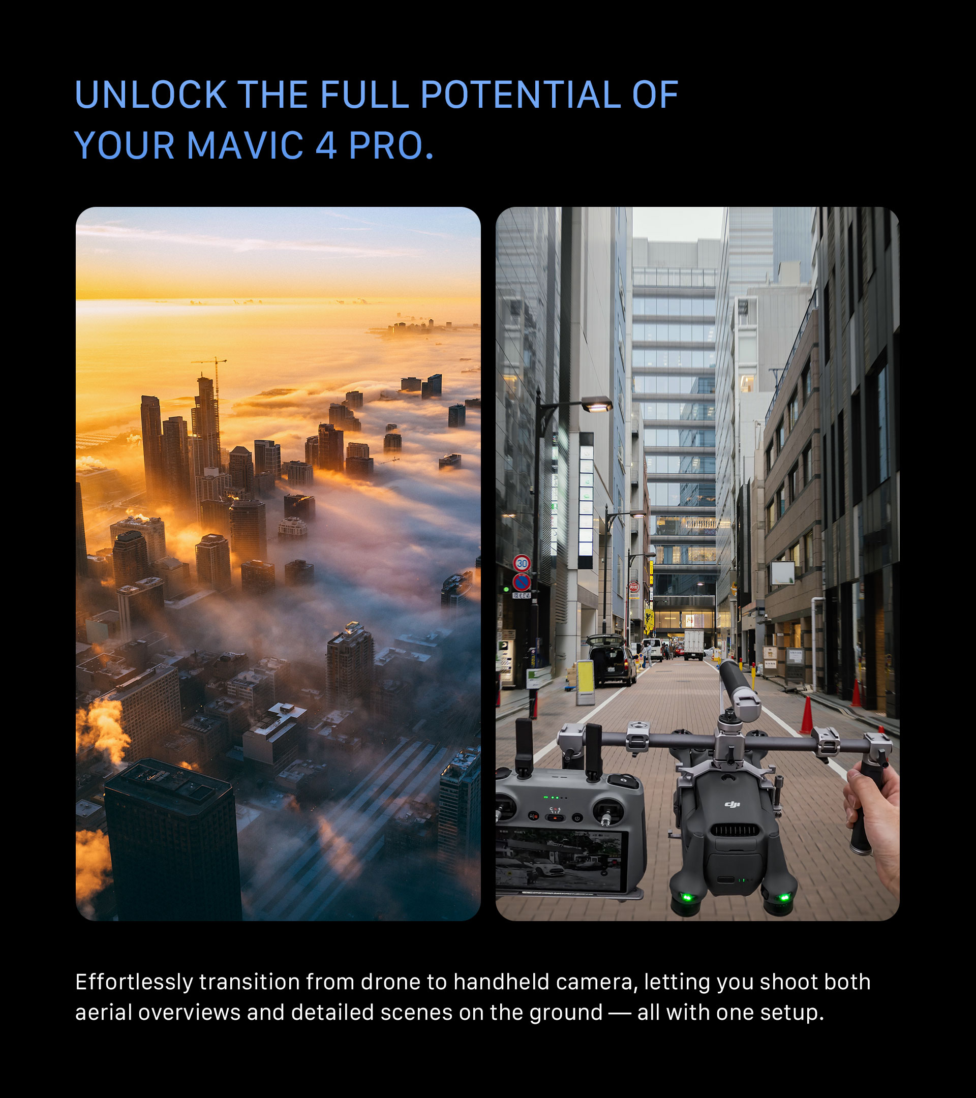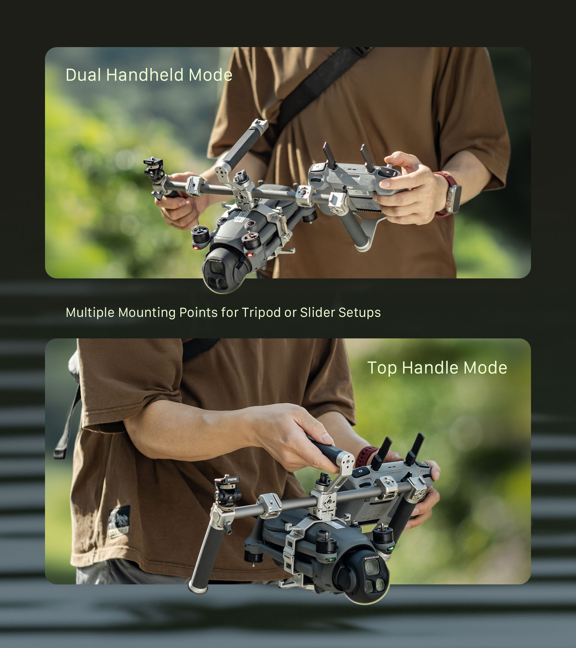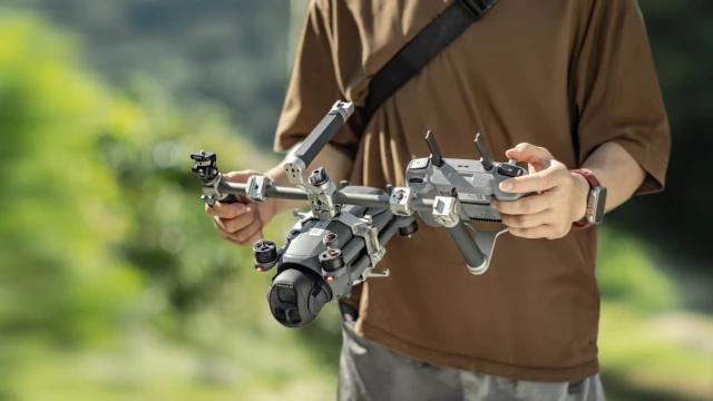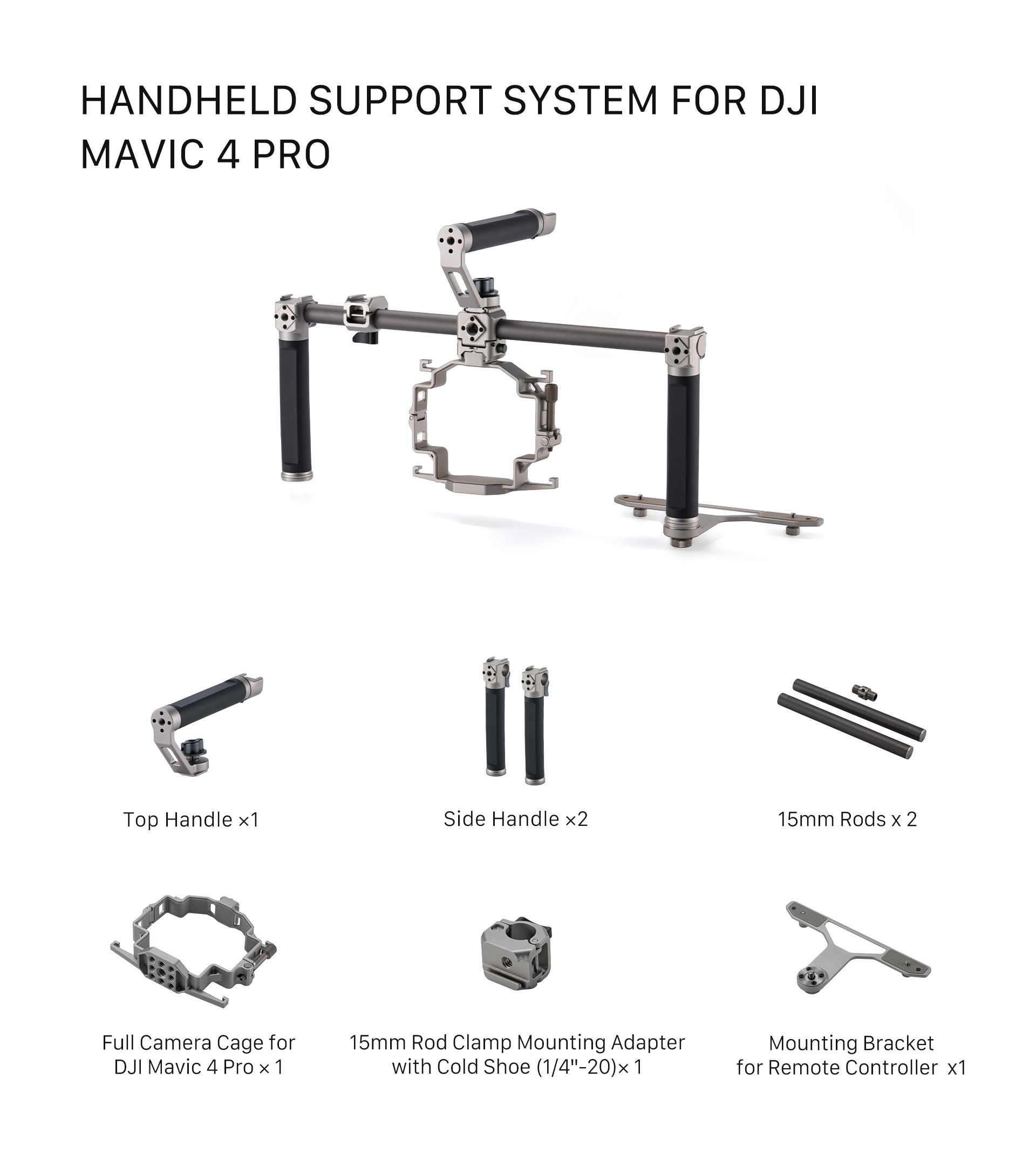 Tento ručný podporný systém otvára nové kreatívne možnosti tým, že premení váš dron na plne funkčnú ručnú kamerovú súpravu. Táto špeciálne navrhnutá kamerová klietka je ideálna pre filmárov, tvorcov obsahu a produkčné tímy na cestách a ponúka stabilné a ergonomické riešenie pre pozemné snímanie s Mavic 4 Pro.