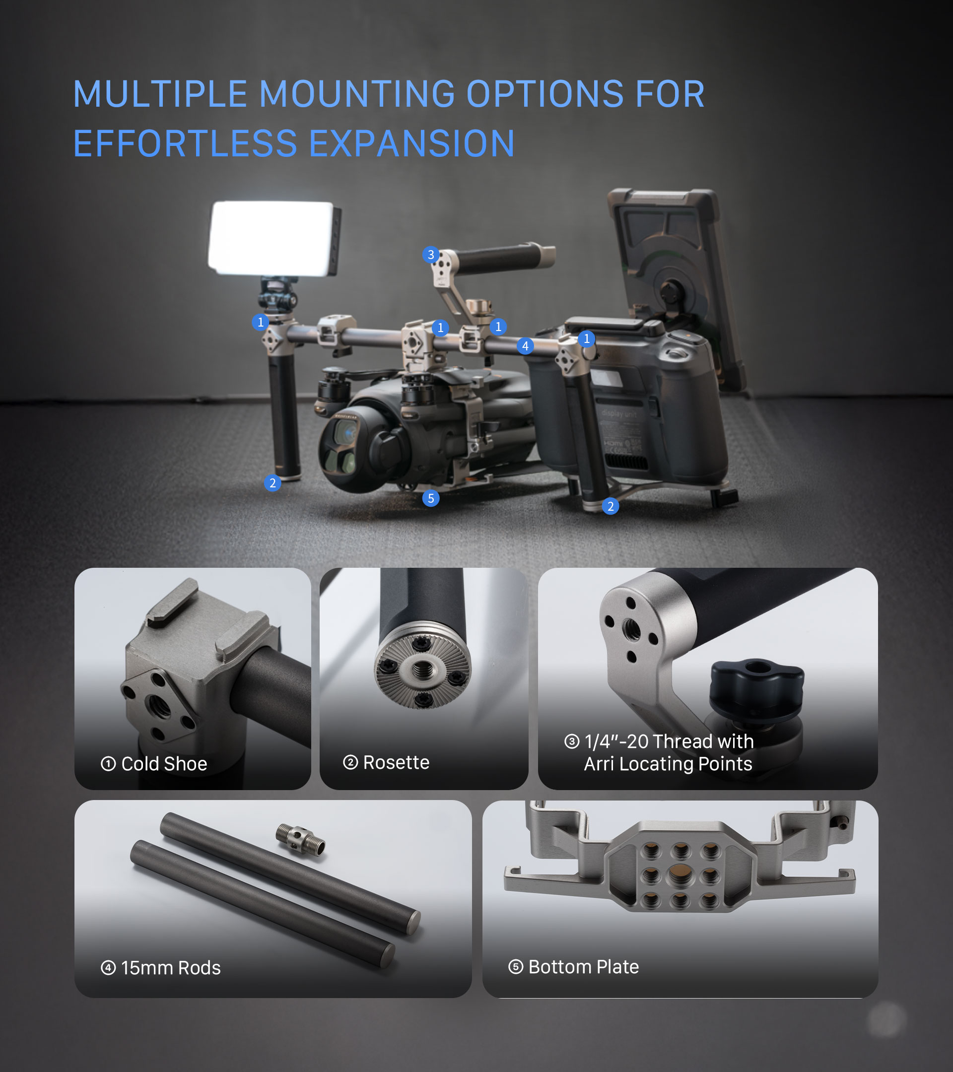 Dodatočné montážne body, ako napríklad prijímač Cold Shoe, 15 mm tyč, rozeta a 1/4″-20 závity s polohovacími bodmi, rozširujú možnosti pripevnenia rôzneho príslušenstva, ako napríklad integrované svetlá.