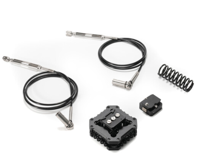 Súprava Tilta HDA-T08-MK-R2 nahrádza štandardné polyuretánové tlmiče oceľovými tlmičmi, ktoré vynikajú v tlmení silných vibrácií z nerovných ciest a jazdy vysokou rýchlosťou. Pevnejšia ťažká pružina zvyšuje bezpečnú pracovnú záťaž na 28,7 lb, zatiaľ čo priložená rýchloupínací adaptér Ronin 2 umožňuje priamu montáž gimbalu bez použitia náradia a bez dodatočných rybinových spojov. Dva 2-metrové nerezové nosné káble zvyšujú redundanciu a ďalej stabilizujú systém. Poznámka: táto úprava obmedzuje rameno len na dve časti (bez tretieho predĺženia), aby sa zachovali bezpečnostné rezervy pri vyššom zaťažení.