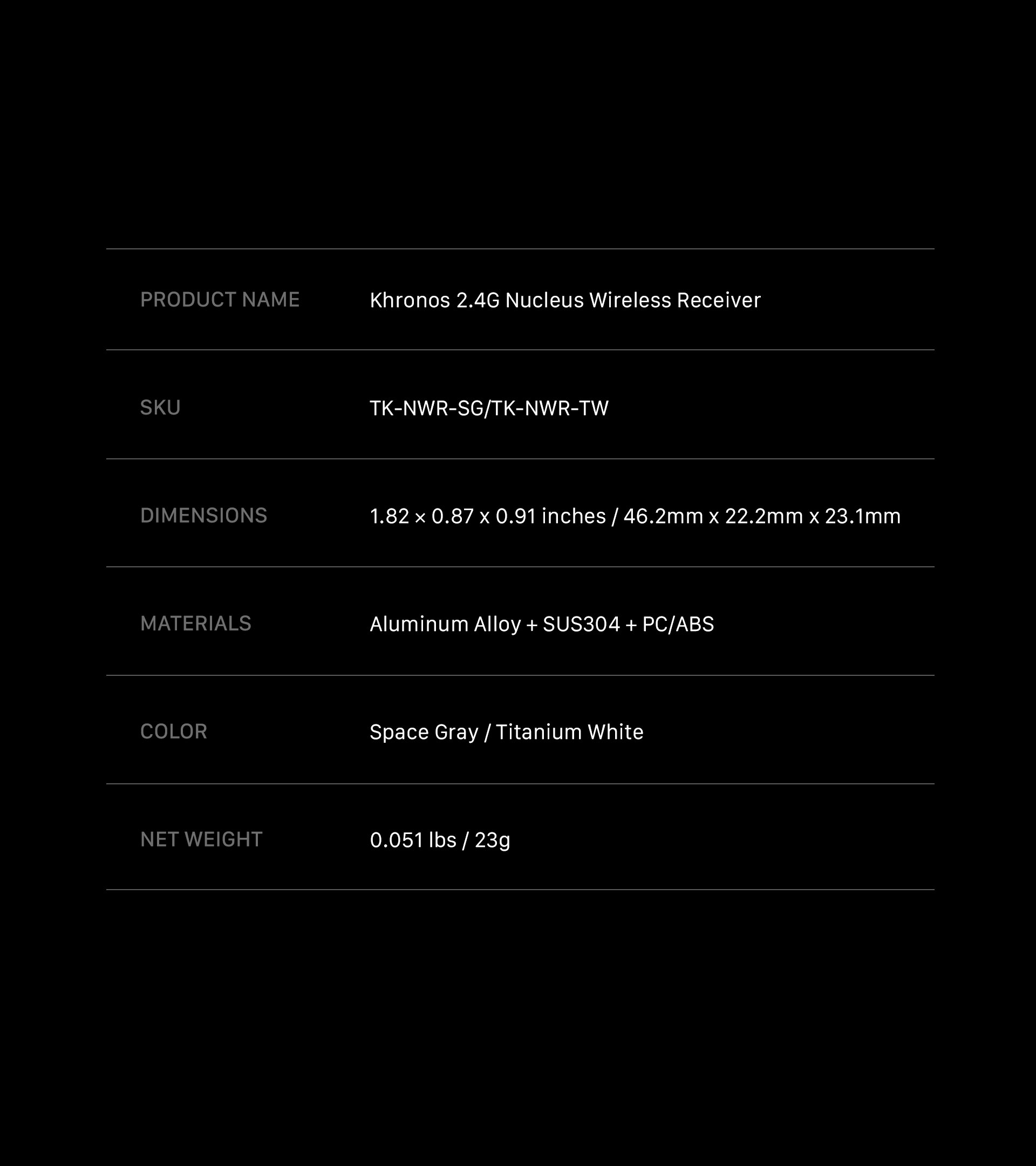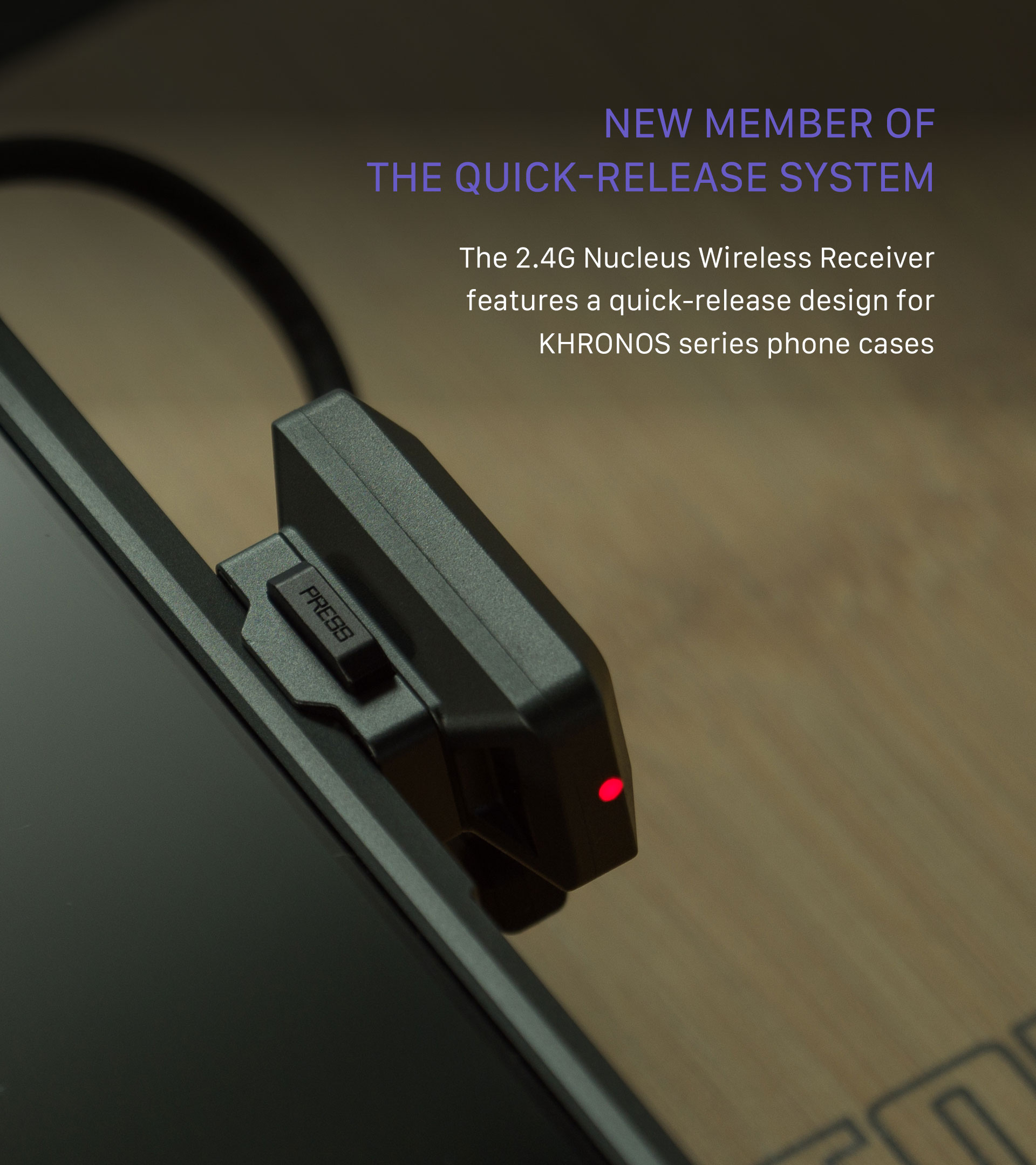 Predstavujeme bezdrôtový prijímač Khronos 2.4G Nucleus. Toto príslušenstvo sa montuje pomocou rýchloupínacieho konektora, ktorý nájdete na našom puzdre Khronos pre iPhone, a pripája sa k telefónom iPhone 15 Pro a Pro Max pomocou priloženého kábla USB-C.