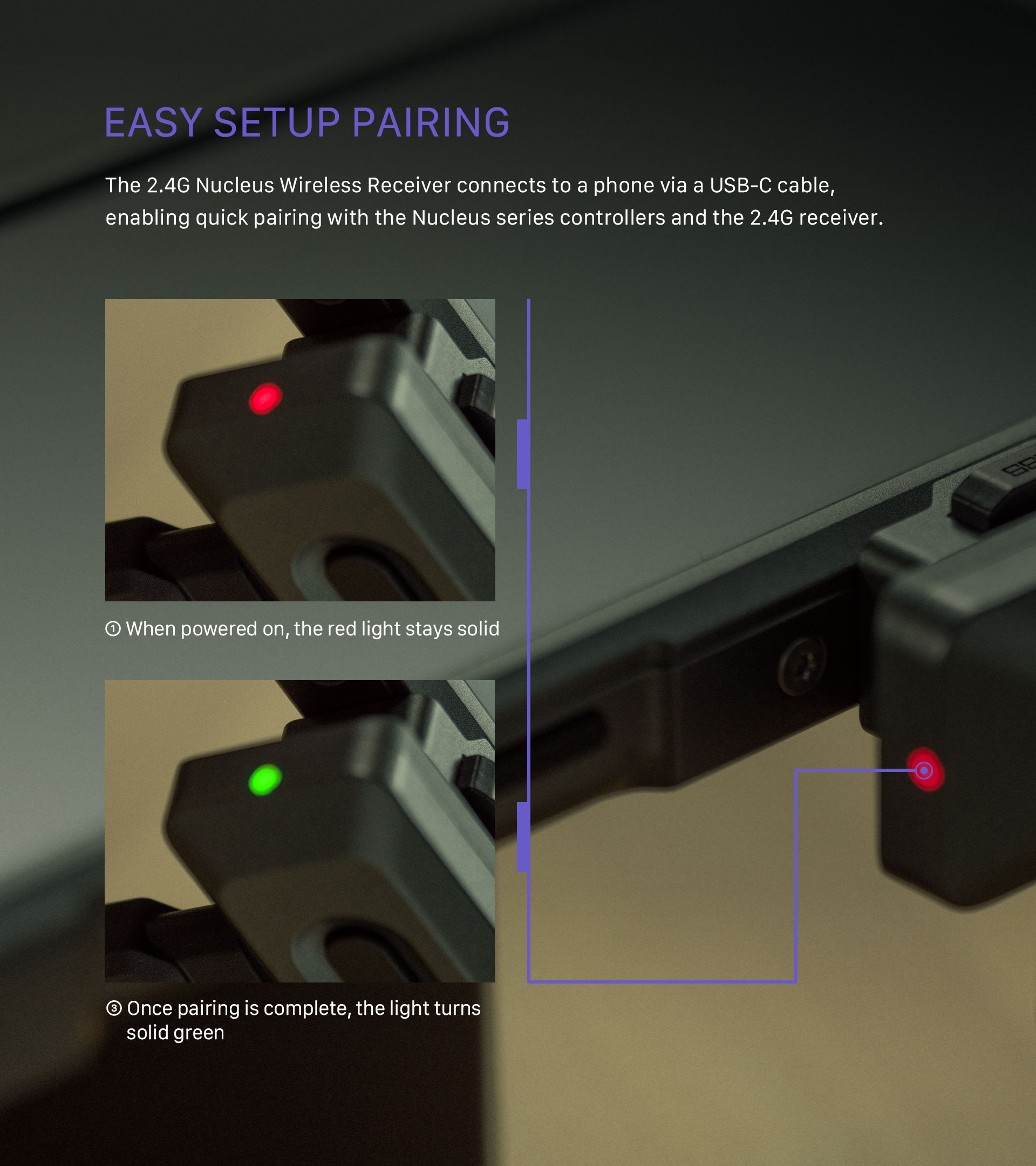Používatelia potom môžu spárovať ručné koliesko Nucleus Nano II prostredníctvom 2,4G, aby mohli ovládať zaostrovanie a zoom prostredníctvom aplikácie Black Magic.
