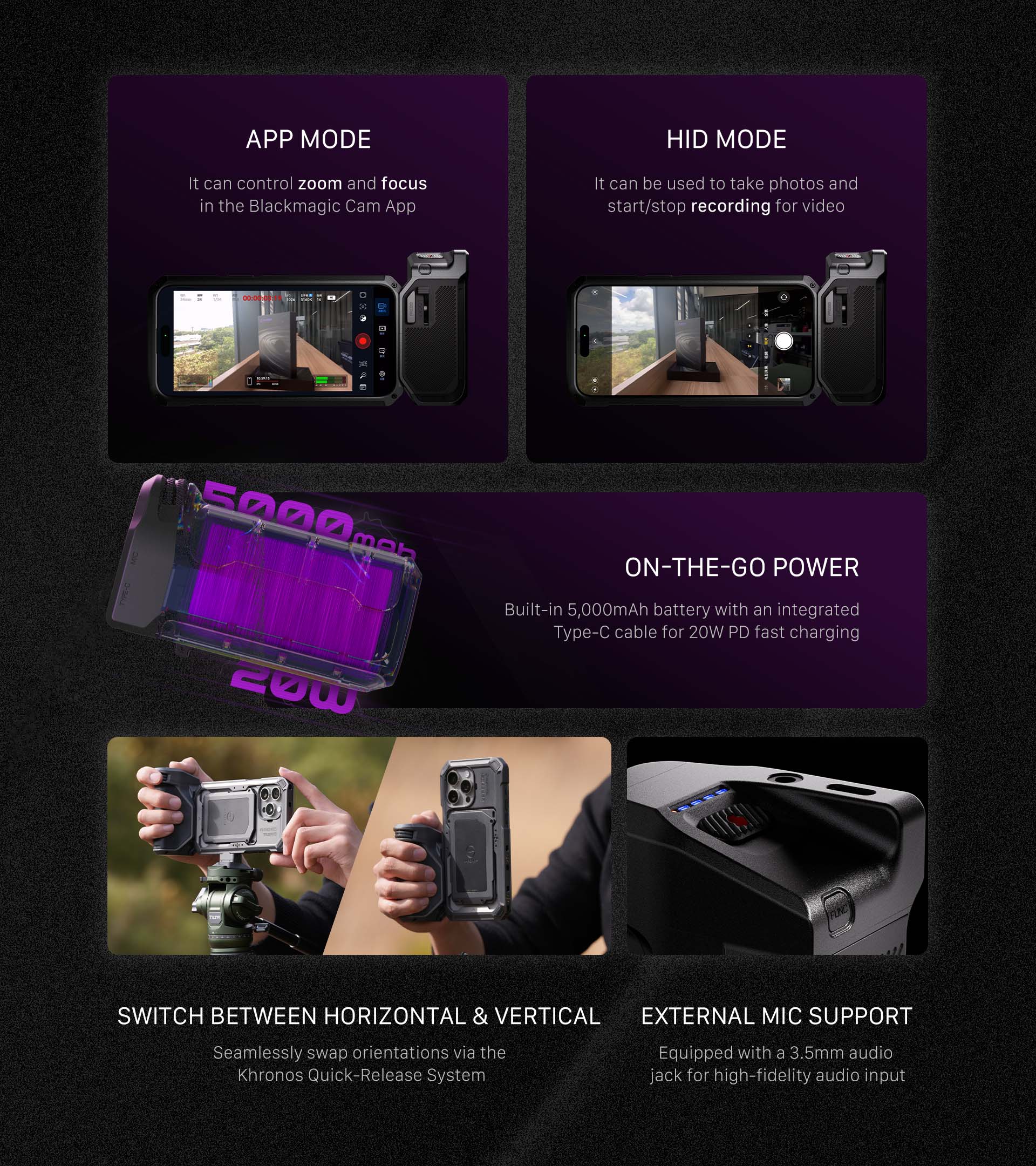 Rukoväť sa pripája k iPhonu 16 prostredníctvom integrovaného kábla USB-C a využíva technológiu bluetooth na ovládanie zaostrovania alebo zoomu prostredníctvom voliča na prednej strane rukoväte. To zároveň poskytuje väčšiu stabilitu pri ovládaní systému a tlačidlo nahrávania zabezpečuje, že používatelia nemusia pustiť rukoväť, aby začali nahrávať.