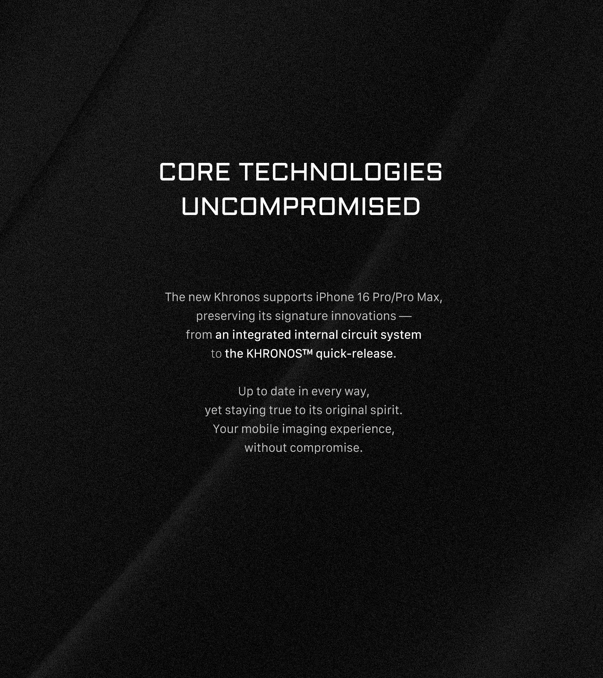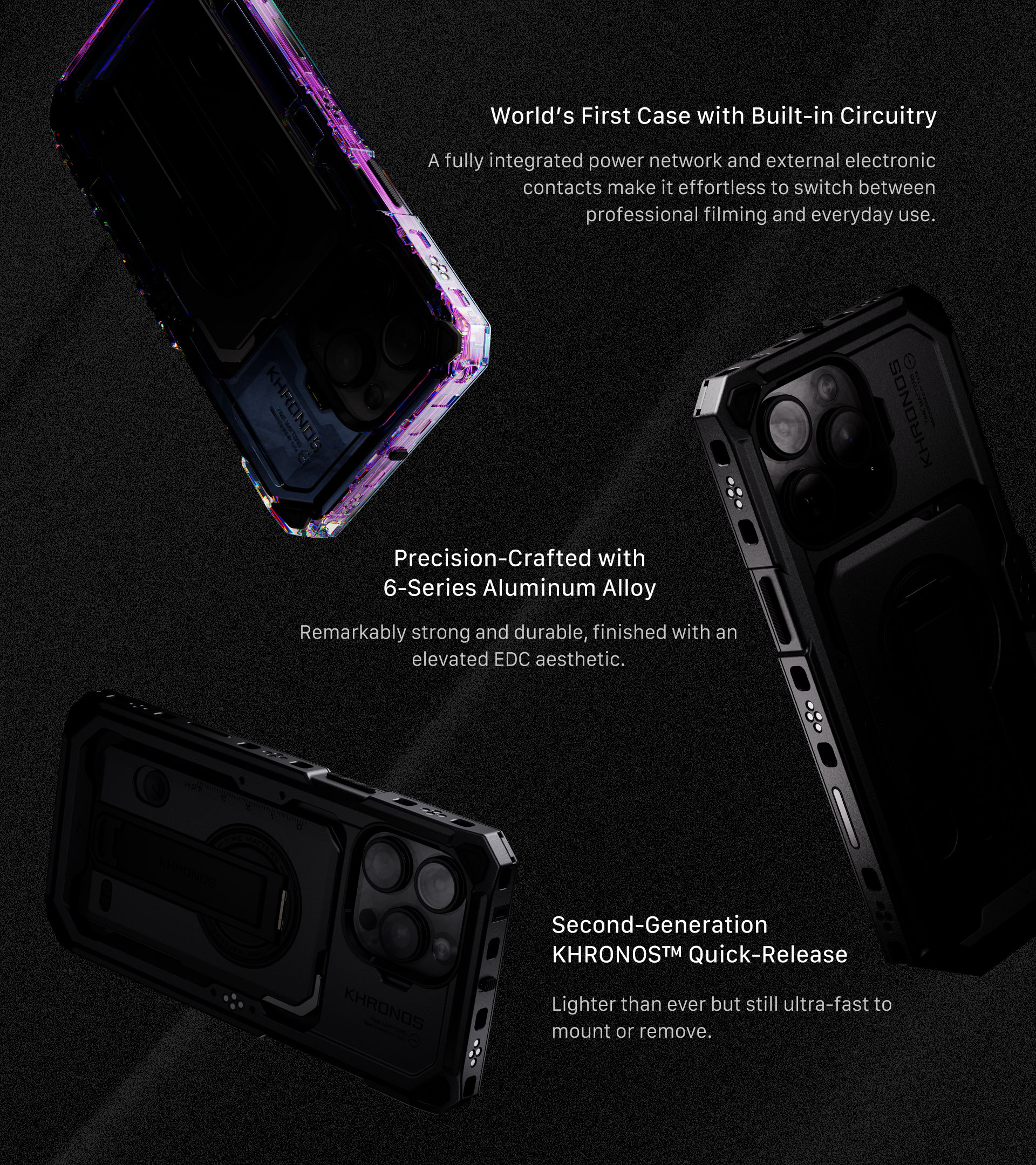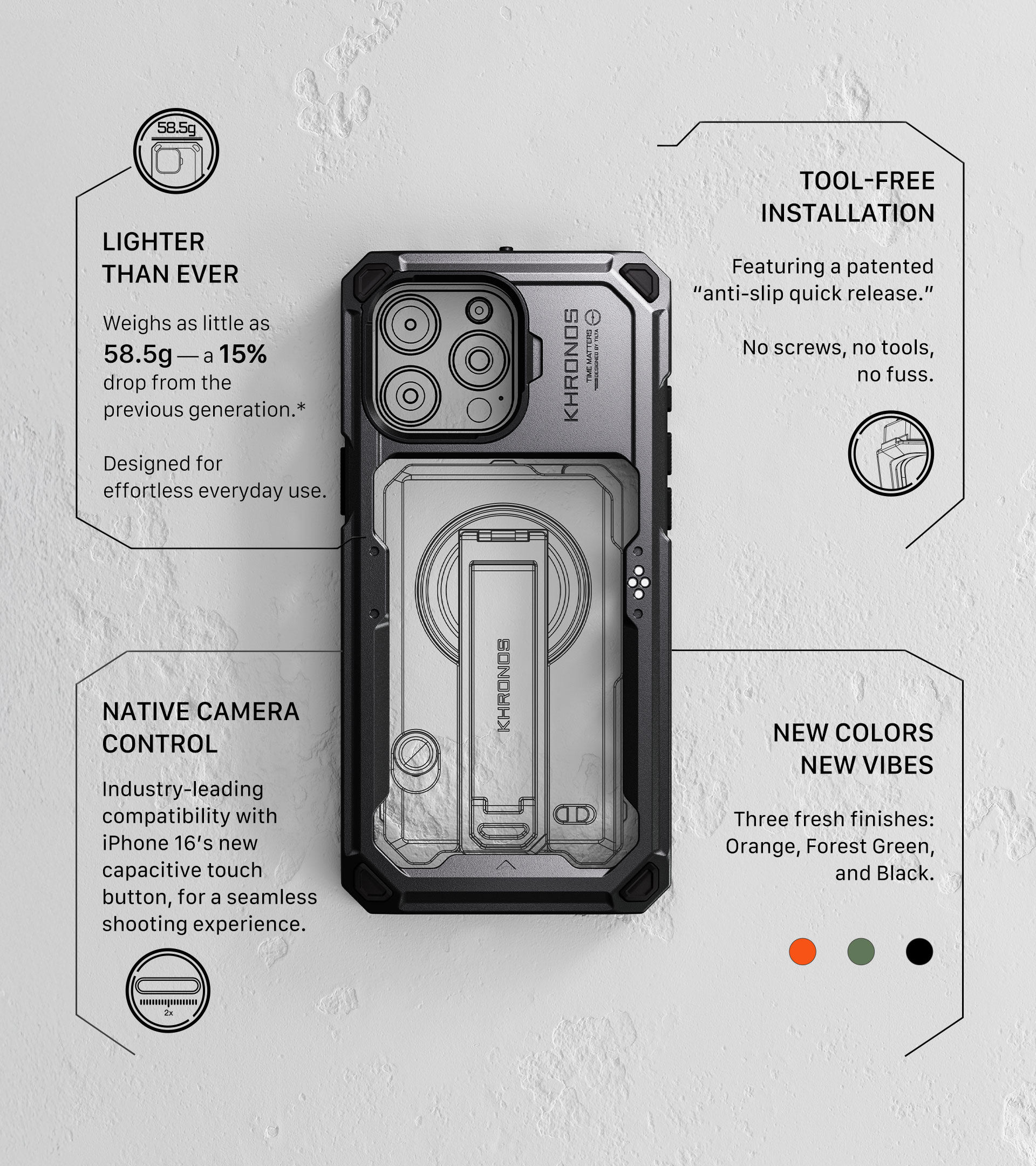 Puzdro Khronos je vybavené integrovanými elektronickými kontaktnými bodmi v celom rozsahu, ktoré umožňujú pri použití voliteľnej napájacej rukoväte prenášať energiu cez klietku na napájanie príslušenstva. Novinkou v puzdre 16 je ovládací dotykový panel fotoaparátu, ktorý používateľom umožňuje plný prístup k funkciám dotykového panela na iPhone 16.