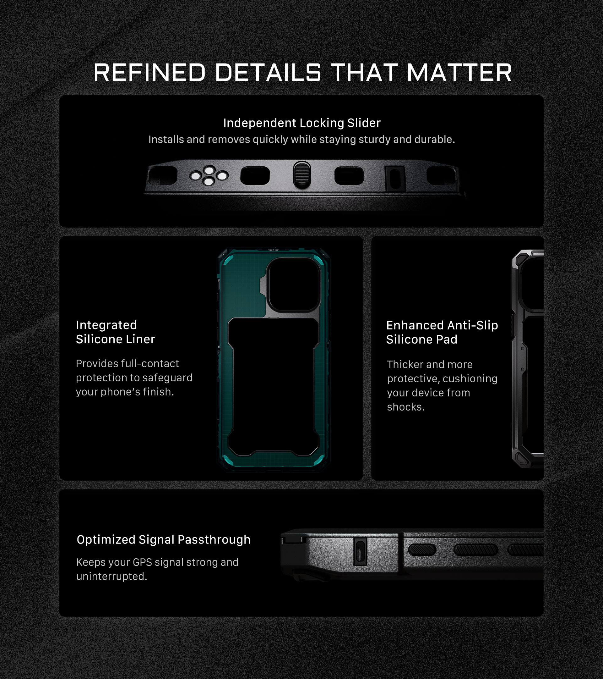 Inštalácia je jednoduchšia ako kedykoľvek predtým, pretože toto aktualizované puzdro je vybavené rýchloupínacím zacvakávacím dizajnom, ktorý používateľom umožňuje puzdro rýchlo nainštalovať alebo odstrániť a zároveň zaručuje, že akékoľvek pripojené príslušenstvo zostane bezpečne pripevnené.