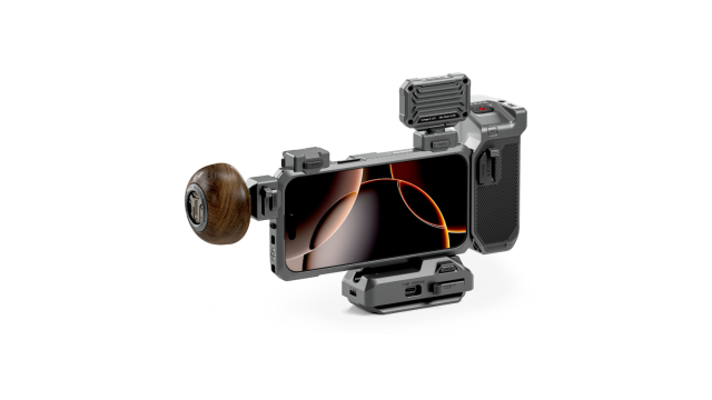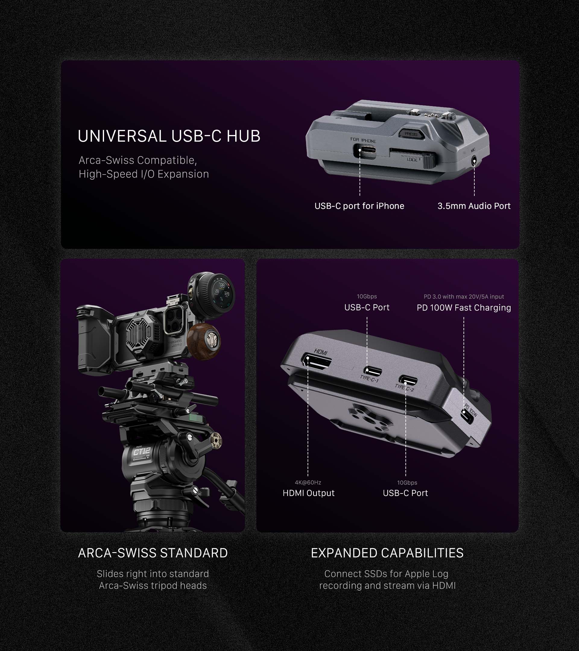 Súčasťou tejto súpravy je aj rozbočovač USB-C, ktorý sa pripája k iPhonu cez USB-C a rozširuje možnosti pripojenia externých diskov, ako aj externých monitorov cez port HDMI. Spodná časť tohto rozbočovača USB-C je vybavená integrovanou rýchloupínacou doštičkou ARCA, vďaka ktorej je ideálna na montáž na statív alebo kardanový stabilizátor.