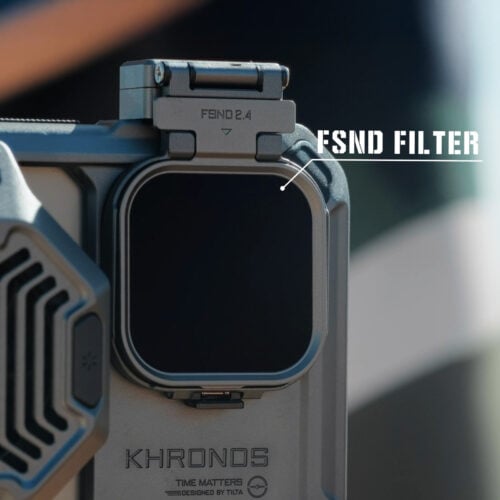 Zásobník na filtre sa ľahko pripevní k puzdru Khronos pomocou bezpečného magnetického spojenia a je vybavený otočným držiakom, ktorý umožňuje, aby zásobník spadol na miesto nad všetkými tromi objektívmi iPhone 15 Pro/Pro Max.