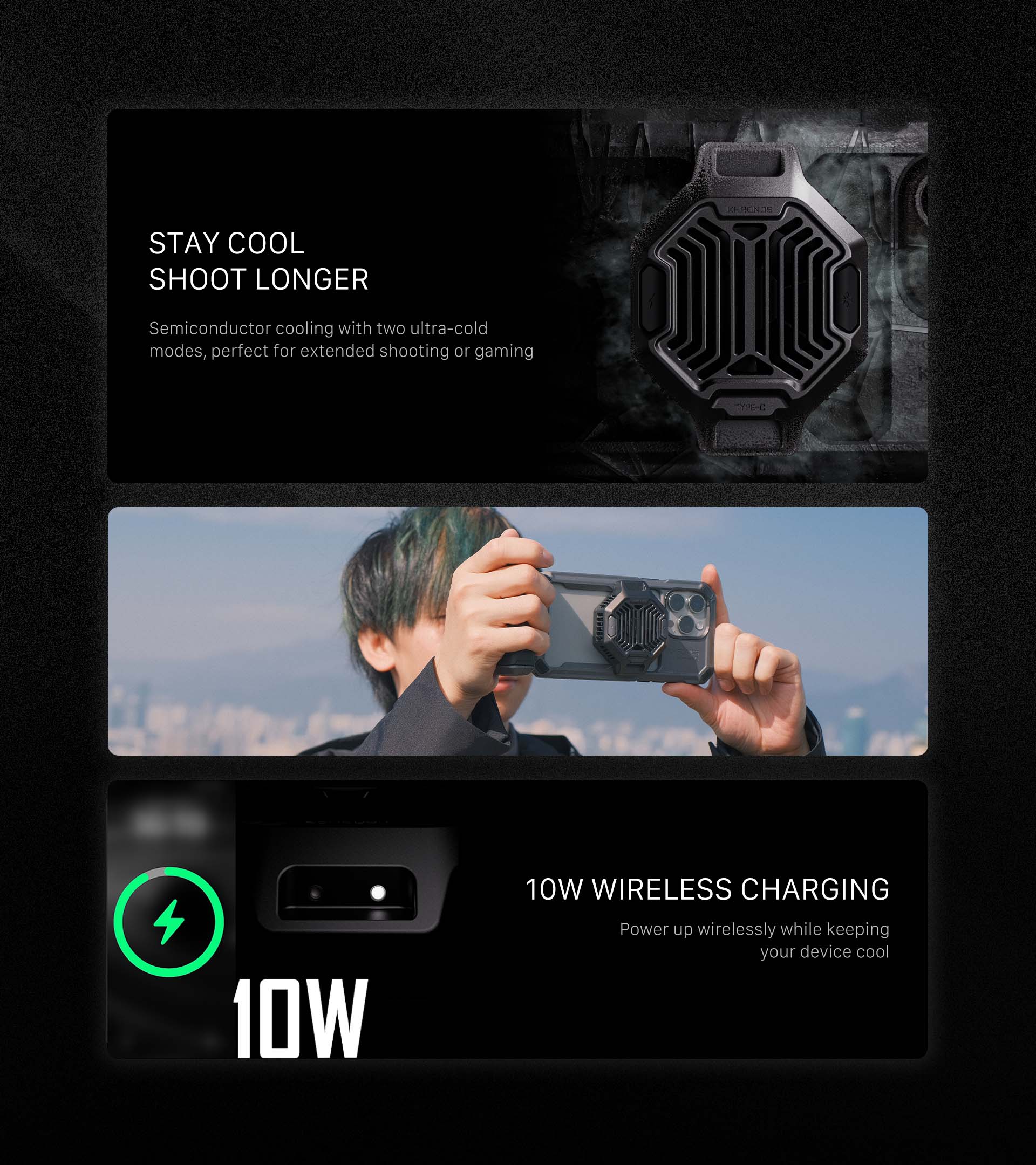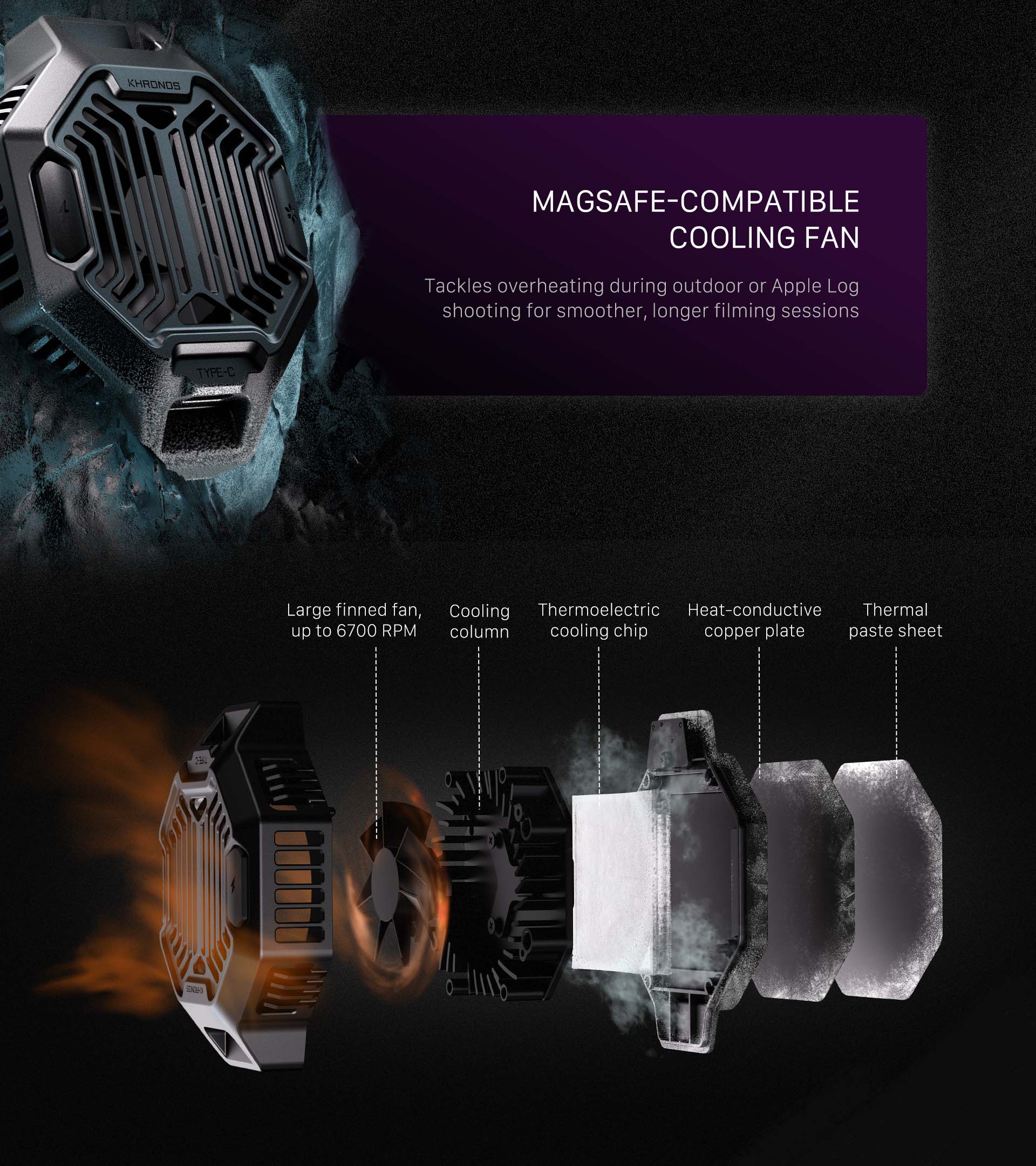 Súčasťou súpravy je aj chladiaci systém V2 pre Khronos, ktorý je vybavený 22W variabilným frekvenčným rozptyľovačom tepla schopným. Stačí ho pripojiť k externému zdroju napájania cez USB-C alebo využiť napájanie z priloženej rukoväte na súčasné nabíjanie iPhonu a udržiavanie jeho teploty s využitím bezdrôtového magnetického pripojenia MagSafe.