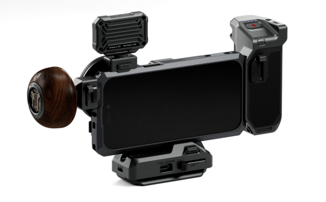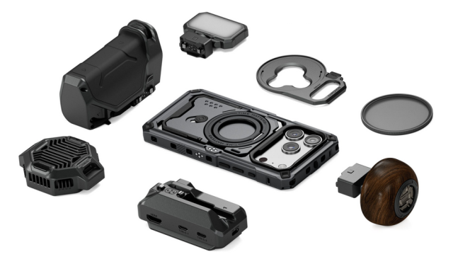 Rozšírenie a monitorovanie: Súčasťou balenia je rozbočovač USB-C, ktorý sa pripája k portu USB-C telefónu, rozširuje možnosti pripojenia externého úložiska (SSD) a poskytuje port HDMI na pripojenie externých monitorov. Rozbočovač je vybavený integrovanou rýchloupínacou doskou ARCA na okamžité pripevnenie statívu/gimbalu.