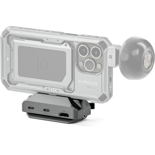 Rýchloupínací rozbočovač USB-C Tilta Khronos vo vesmírne sivej farbe rozširuje možnosti pripojenia iPhonu integráciou s externými zariadeniami a upevnením na statív alebo kardanový stabilizátor. Tento všestranný rozbočovač obsahuje dva porty USB-C, port HDMI a 3,5 mm zvukový výstup, ktoré sú zabudované do integrovanej rýchloupínacej dosky ARCA, čo umožňuje súčasné používanie portov USB-C na bezproblémové pripojenie a správu napájania.