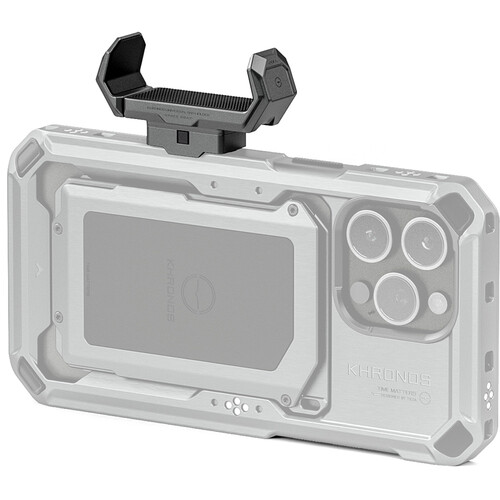 Univerzálny držiak SSD Tilta Khronos vo vesmírne sivej farbe umožňuje pohodlne pripojiť externý disk SSD alebo iné príslušenstvo k puzdru Khronos pre iPhone, ktoré je kompatibilné s telefónom iPhone 15 Pro alebo Pro Max. Je vhodný pre zariadenia so šírkou od 1,96 do 2,75 palca a výškou do 0,59 palca.