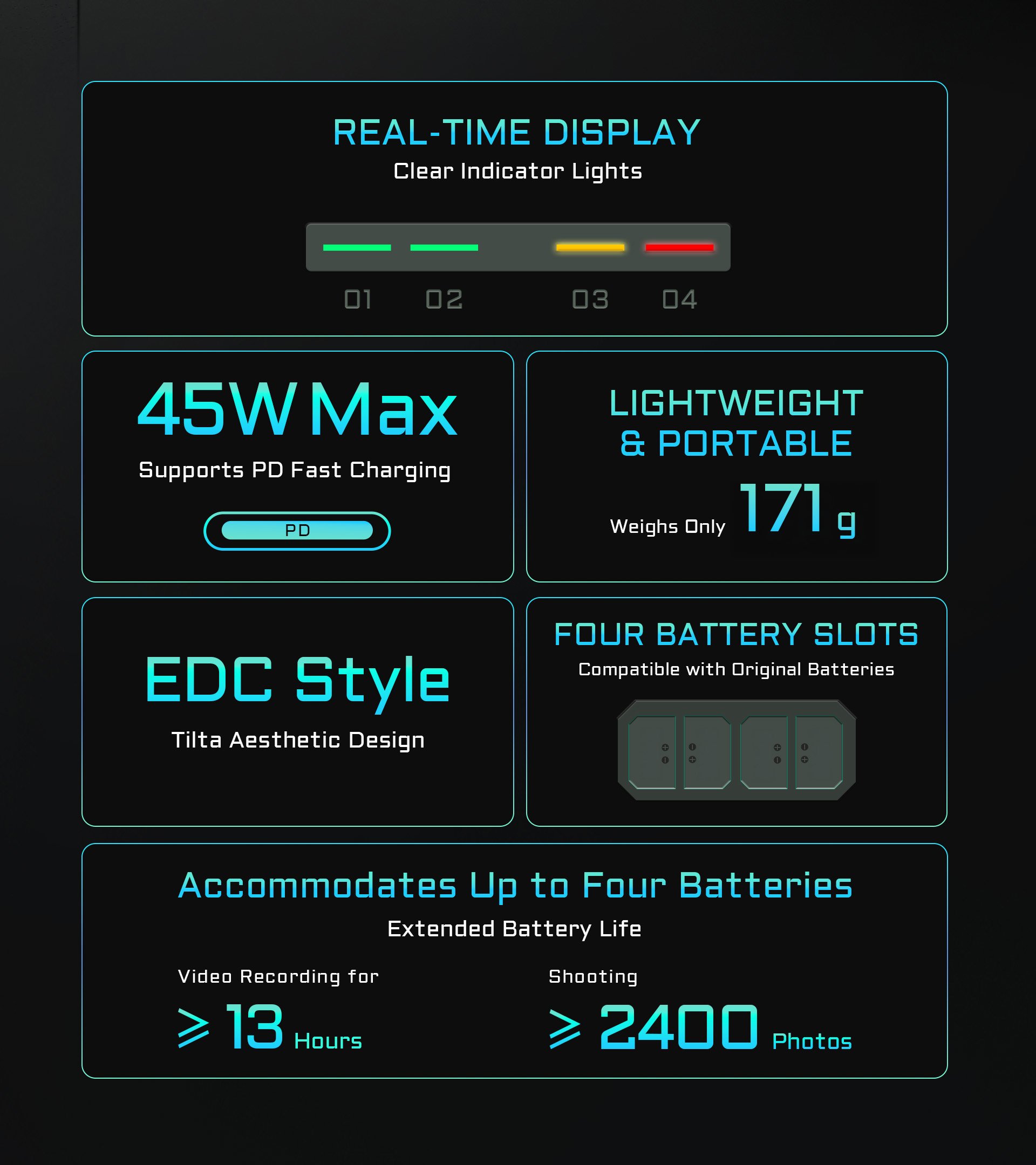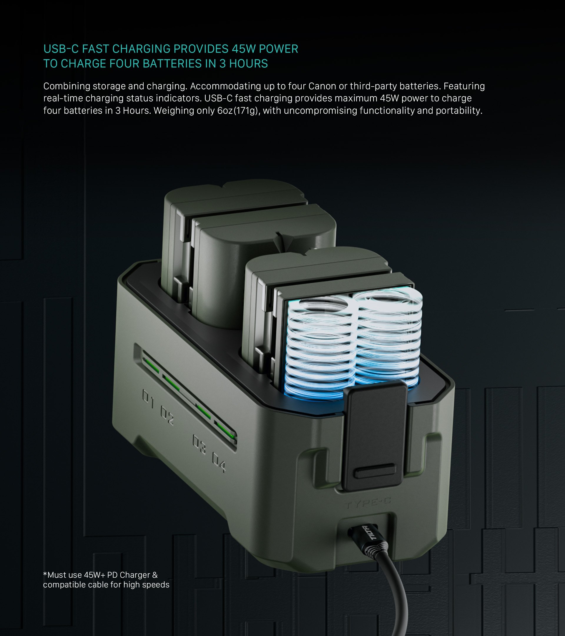 Táto kompaktná nabíjacia stanica je navrhnutá tak, aby podporovala batérie Canon a batérie LP-E6 iných výrobcov, a ponúka štyri sloty na jednoduché nabíjanie a pohodlné skladovanie. Je vybavená rýchlym nabíjaním PD s výkonom 45 W a poskytuje o pôsobivých 68 % vyššiu rýchlosť nabíjania ako štandardná jednoduchá nabíjačka, vďaka čomu sú vaše batérie pripravené na akciu už za 3 hodiny.