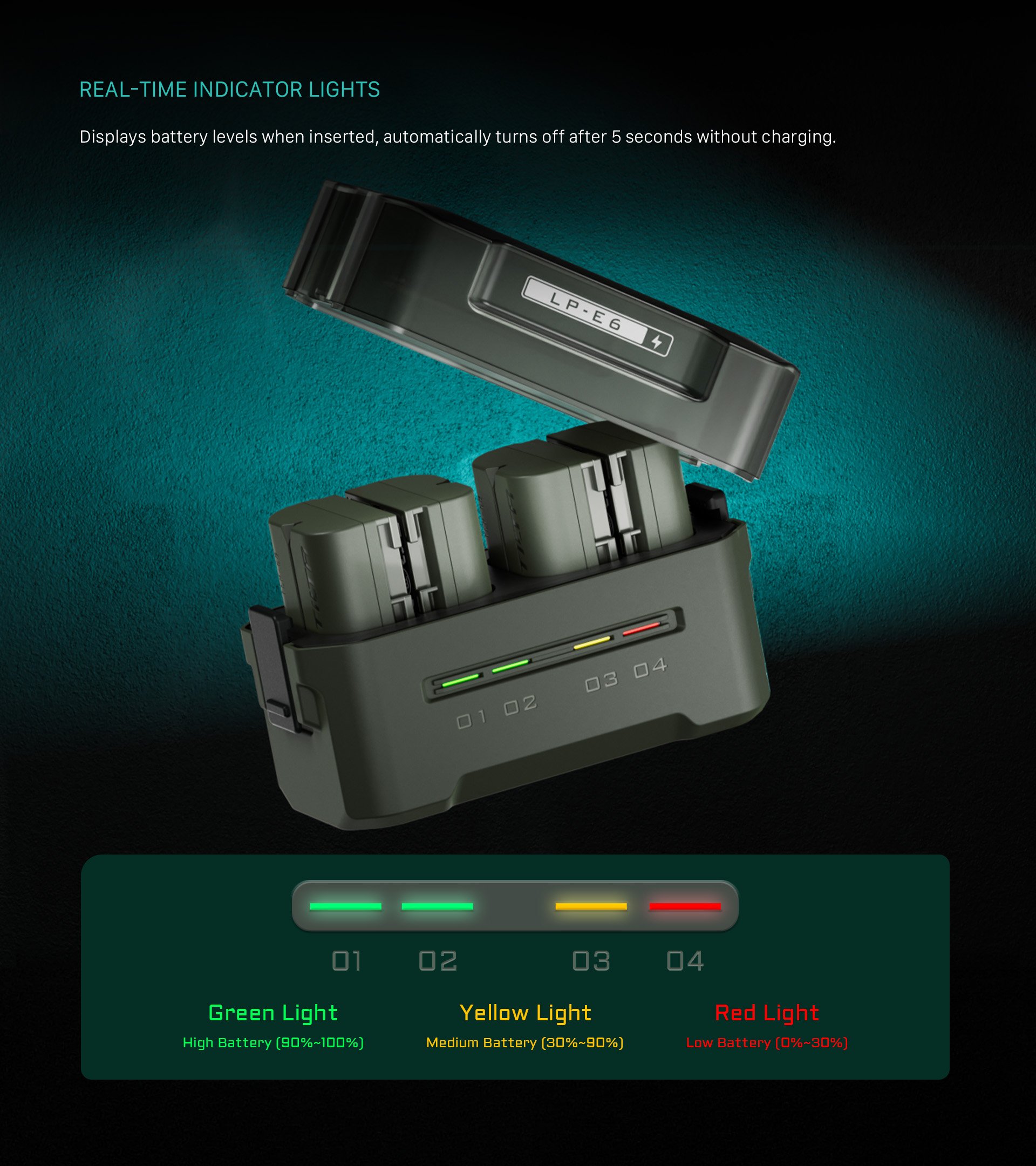 Táto kompaktná nabíjacia stanica je navrhnutá na podporu batérií Canon a batérií LP-E6 iných výrobcov a ponúka štyri sloty na jednoduché nabíjanie a pohodlné skladovanie.