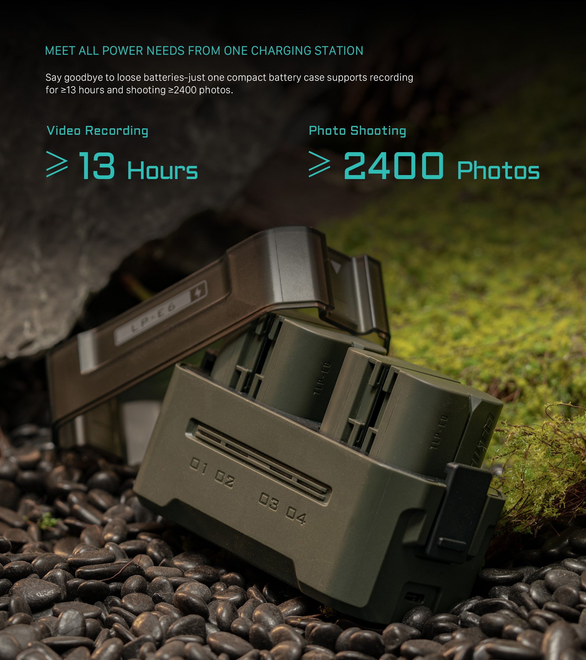 Vďaka schopnosti plne nabiť štyri batérie LP-E6 budú používatelia pripravení až na 13 hodín záznamu videa alebo dostatok energie na spracovanie 2 400 fotografií, čo je ideálne na dlhé fotografovanie.