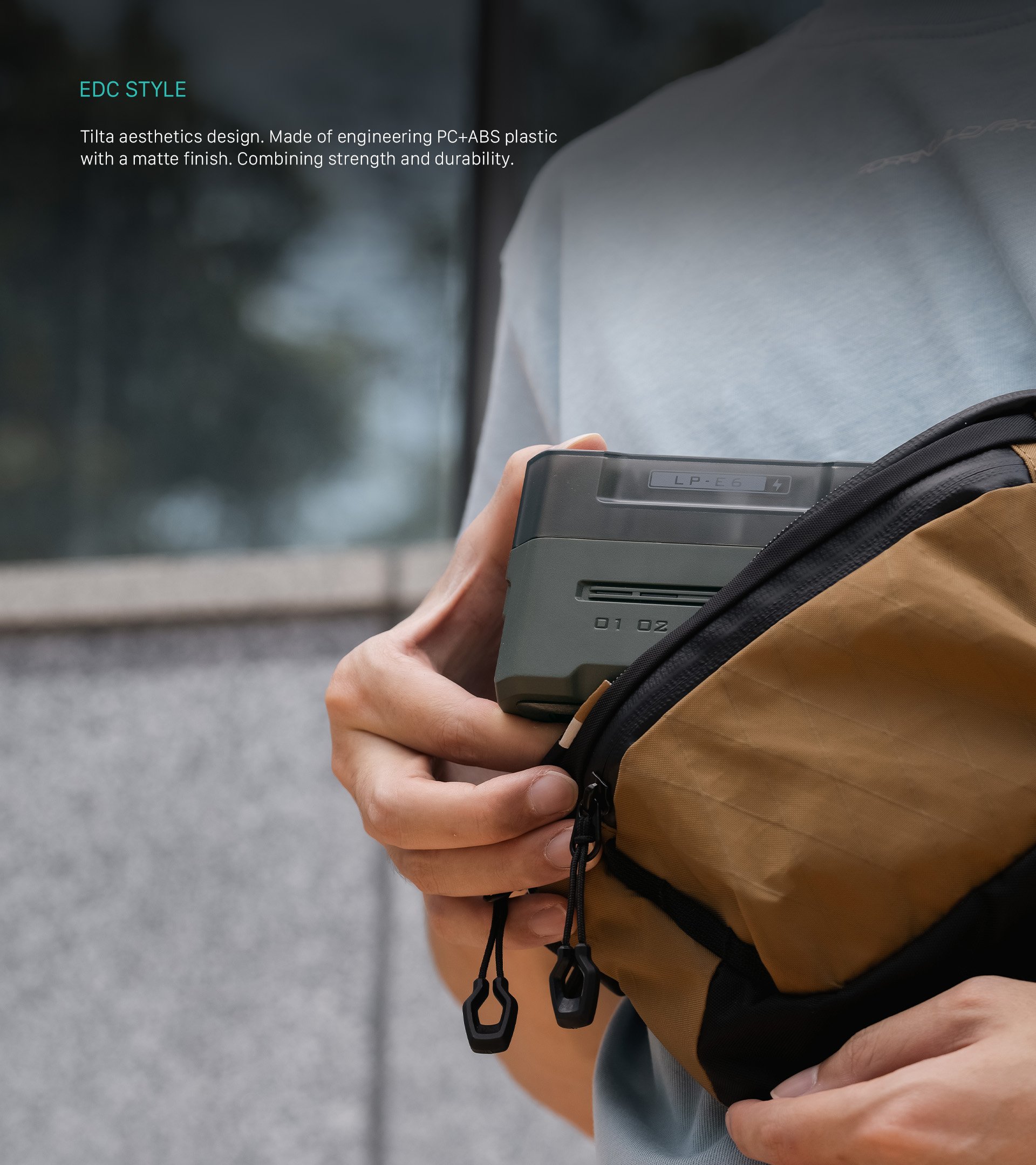 Prenosná nabíjacia stanica Tilta má dizajn v štýle EDC s charakteristickou estetikou značky Tilta, takže je štýlovým a funkčným doplnkom vašej výbavy.