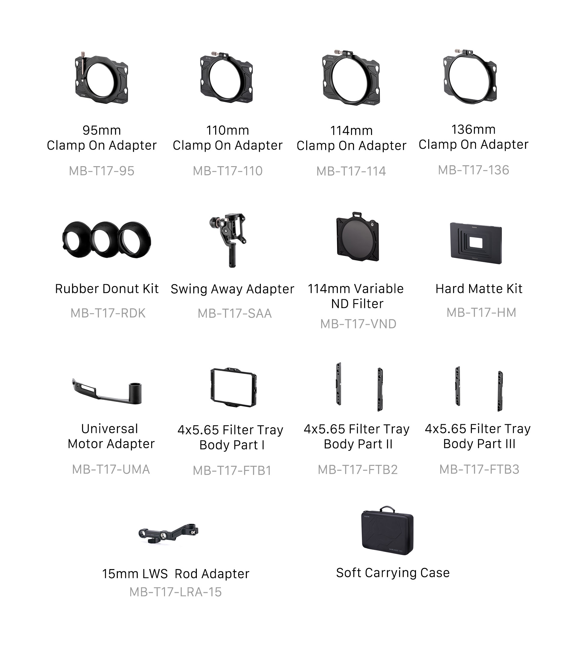 Mirage Pro je upínací matný box, ktorý je vyrobený s dôrazom na detail a je určený na rôzne veľkosti objektívov, pričom podporuje objektívy s vonkajším priemerom 95 mm, 110 mm, 114 mm a 134 mm, ako aj fotografické objektívy s nasledujúcimi adaptérmi na závit filtra: v prípade potreby je možné použiť nasledujúce modely: 67 mm, 72 mm, 77 mm, 82 mm.