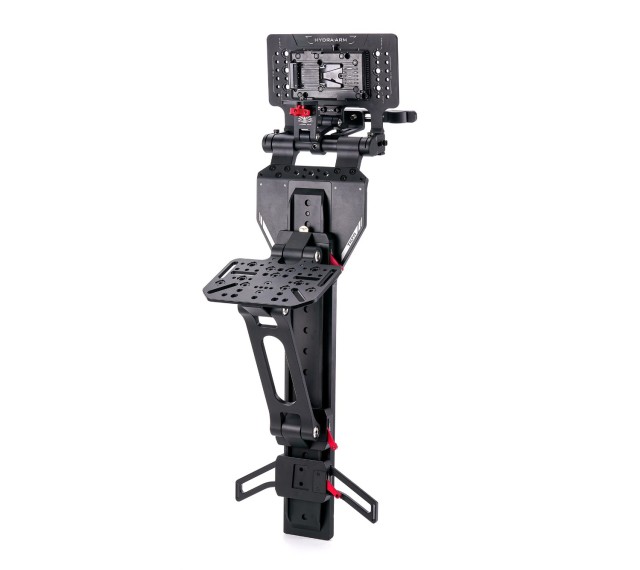 Držiak Tilta Rear Seat Monitor Mounting Bracket Pro je určený na bezpečné podopretie veľkých monitorov a ovládačov na zadnom sedadle automobilu s kamerou. Pripevňuje sa k opierke hlavy a je vybavený dlhou, podlahovou výstuhou na zvýšenie stability. Horná časť obsahuje kĺbový montážny bod 1/4″-20 pre monitory a integrovanú batériovú dosku V-Mount na napájanie zariadení. Tento odolný držiak je ideálny na montáž väčších riadiacich systémov, ako sú napríklad Master Wheels od spoločnosti DJI.